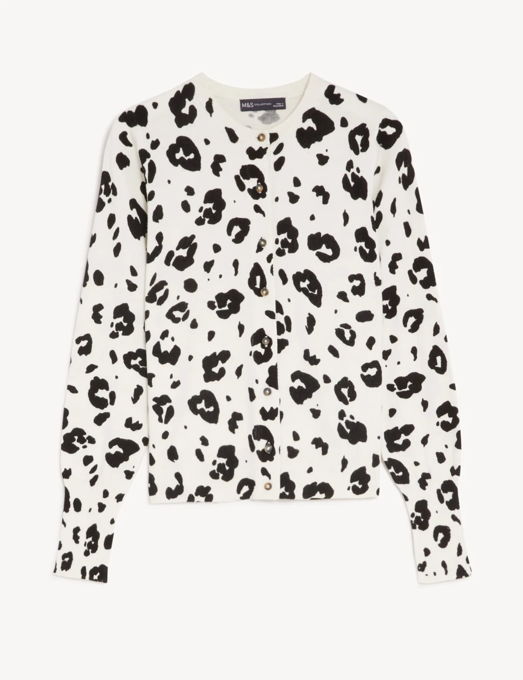 Let your knitwear speak for itself with this bold animal print cardigan. Designed in a regular fit, it features a classic crew neckline and delicate horn buttons through the front.