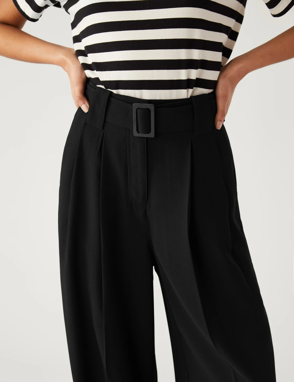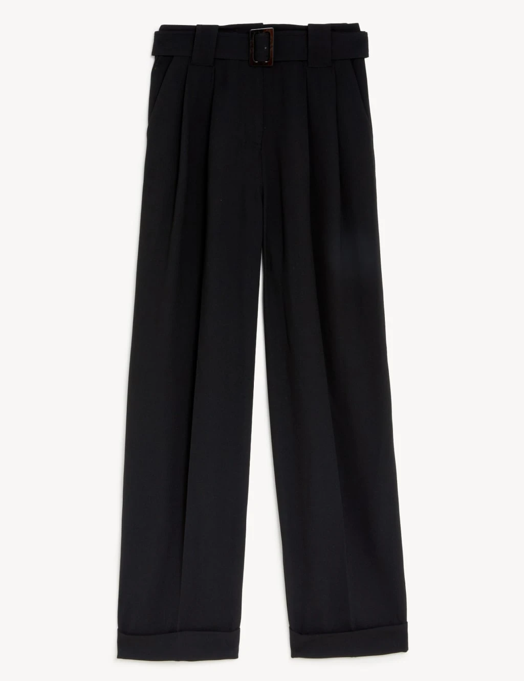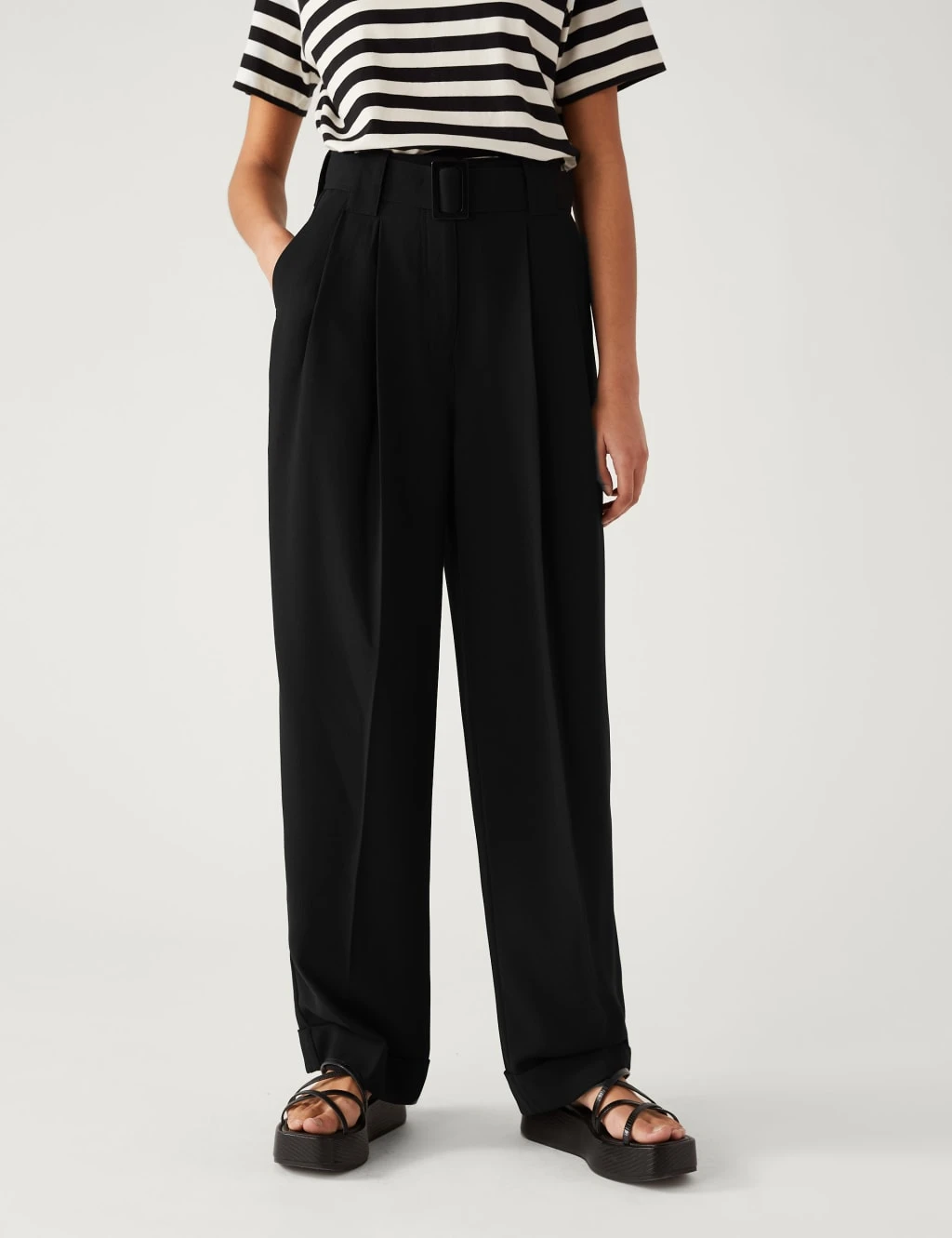 For a refined look in warm weather, opt for these elegant belted trousers. Relaxed straight fit, with a smart hook bar and zip fastening at the high waist. Neat slanted side pockets and turned-up hems add a polished finish.