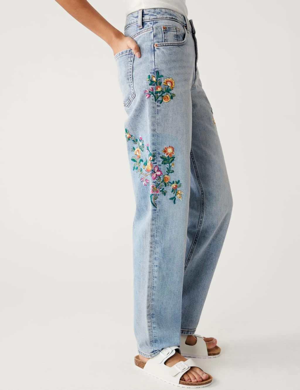 These embroidered jeans will be the star of your casual wardrobe. They’re cut to our popular boyfriend fit, with a looser style through the legs and a contemporary ankle grazer length. The mid-rise waist is secured with a zip and button fastening for easy wear. Added stretch in the authentic washed denim adds extra comfort.