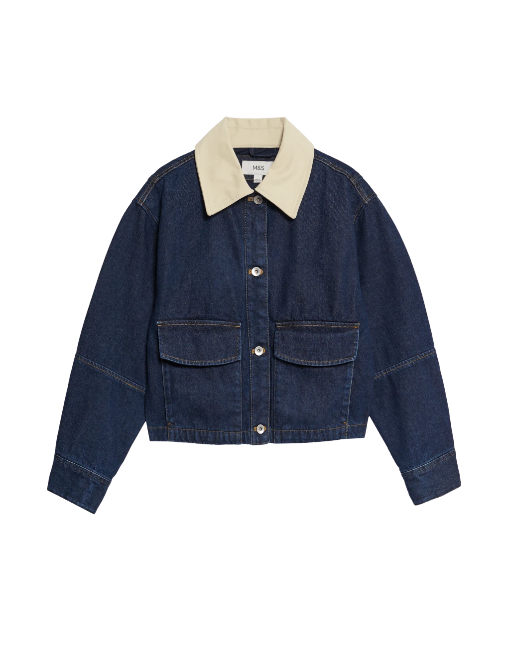Add a cool workwear vibe to your wardrobe with this pure cotton denim jacket. It’s cut in a relaxed fit for a laid-back look, with a contrast collar for a unique twist. The front features two flap pockets and metal buttons.M&S Collection: easy-to-wear wardrobe staples that combine classic and contemporary styles.