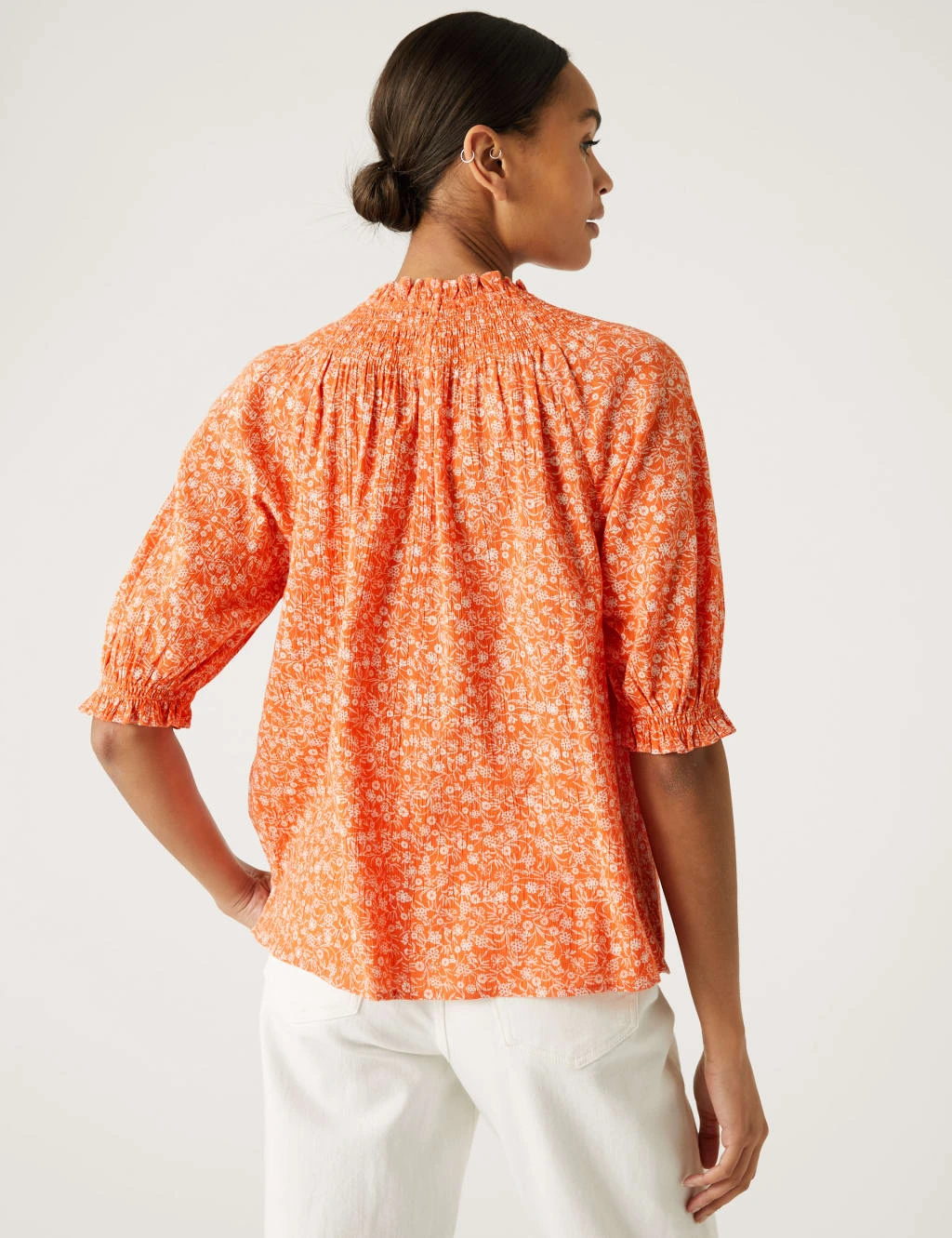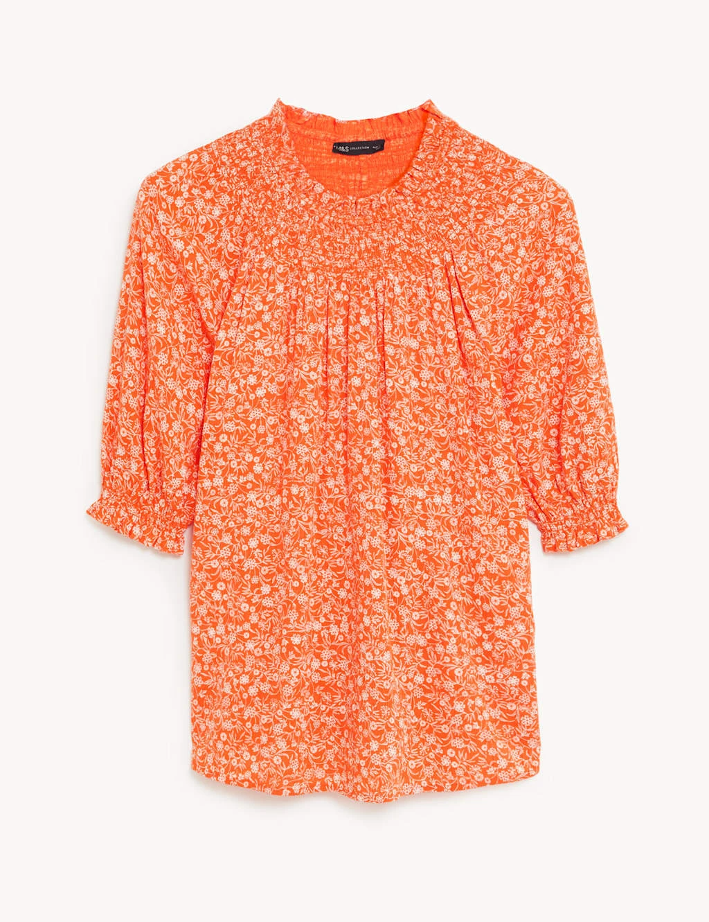 This cotton-blend blouse has a bold print for a striking look. Comfy regular fit, with short puff sleeves for an on-trend silhouette. At the crew neckline, shirred stitching and a ruffled trim add a romantic finish.