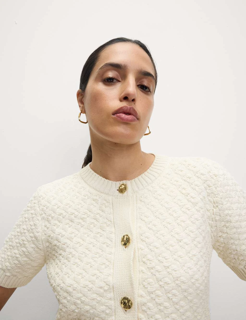 With its textured finish, this cotton-rich cardigan is a stylish addition to your knitwear collection. It’s designed in a flattering slim fit, with a cropped length and short sleeves for a light feel. The piece is complete with a timeless crew neckline and ribbed trims on the edges. M&S Collection: easy-to-wear wardrobe staples that combine classic and contemporary styles.