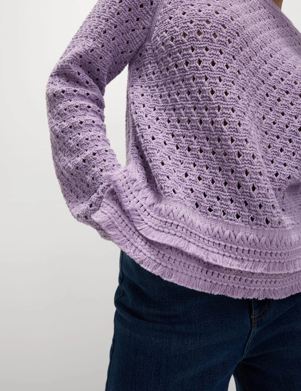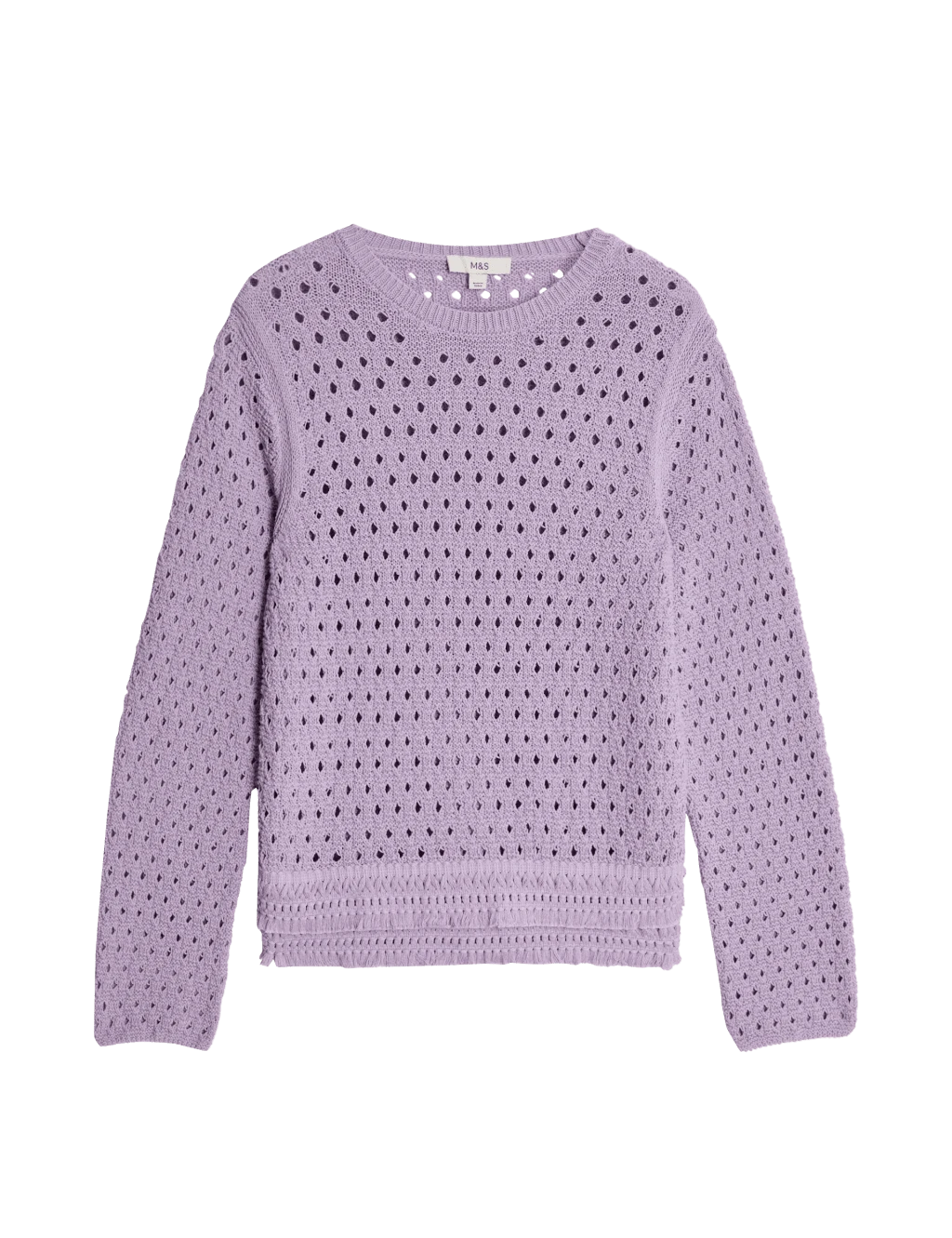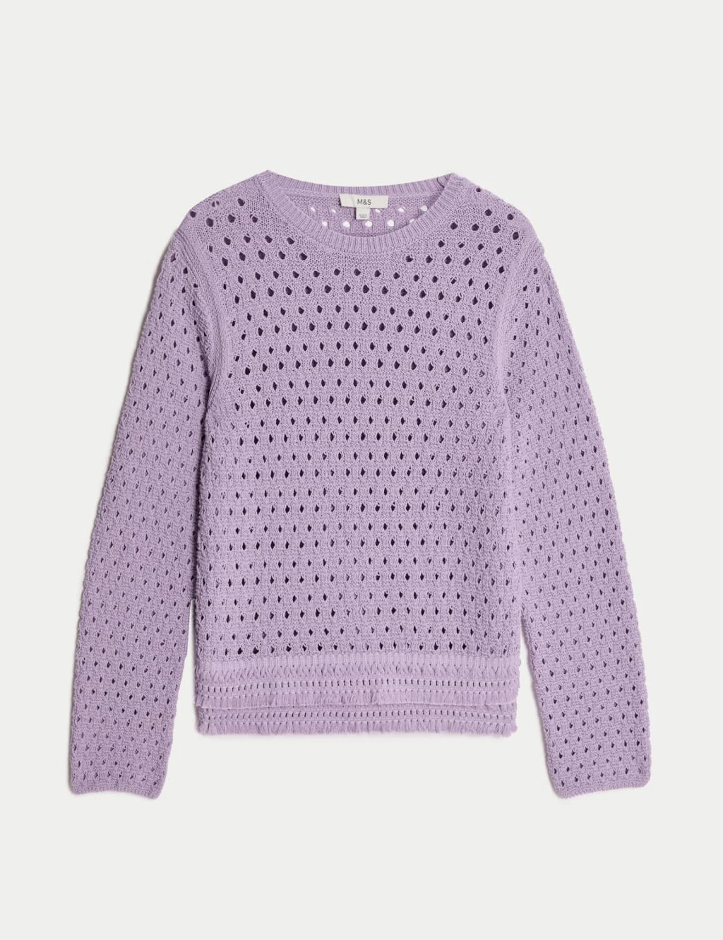 Add visual interest to your knitwear collection with this beautifully textured cotton-blend jumper, ideal as an essential sweater or pullover. Designed in a comfortable regular fit with a classic crew neckline, it’s perfect for easy everyday styling. The feminine pointelle stitching creates stunning detail throughout, while the playful fringed hemline adds a distinctive finishing touch.M&S Collection: easy-to-wear wardrobe staples that combine classic and contemporary styles.