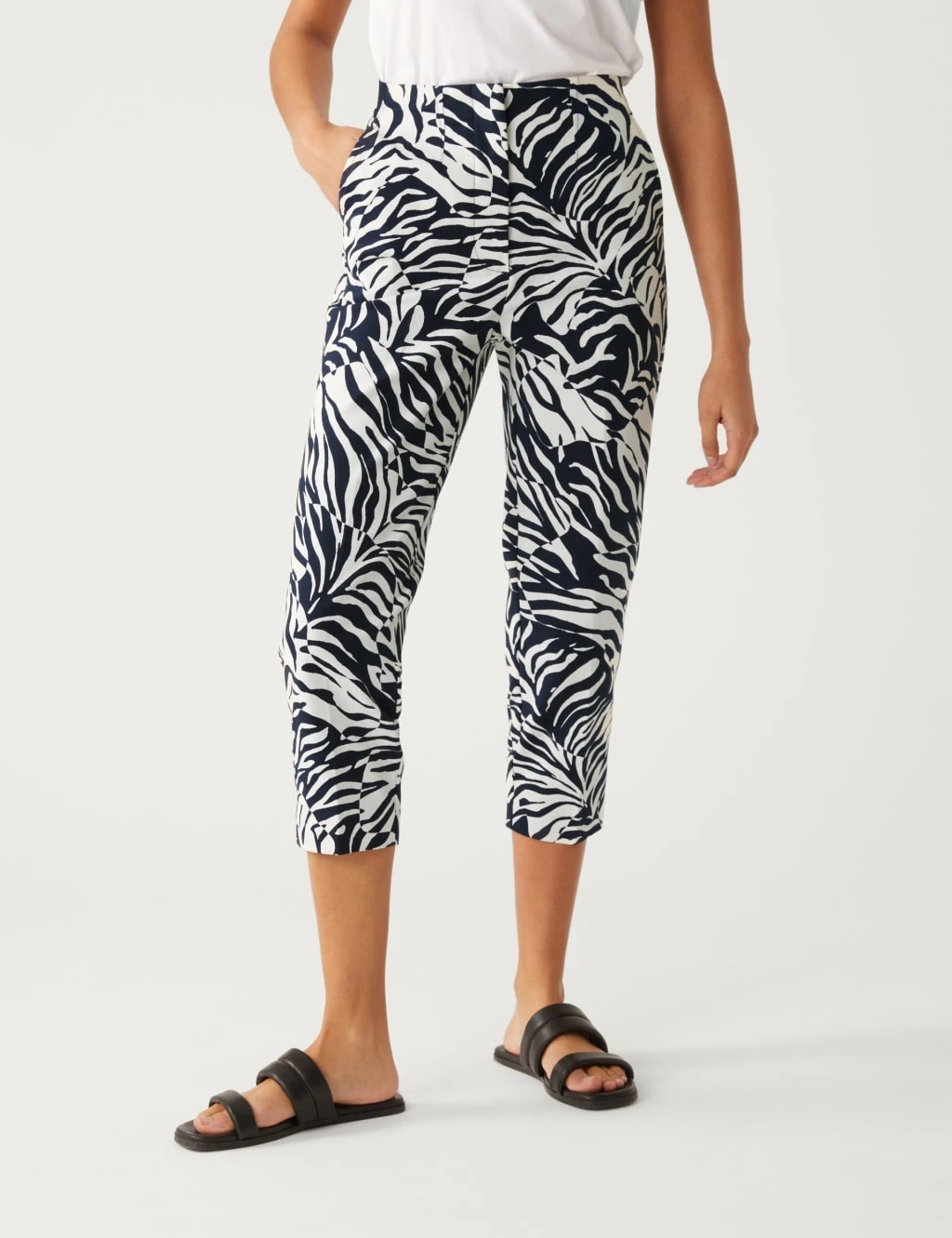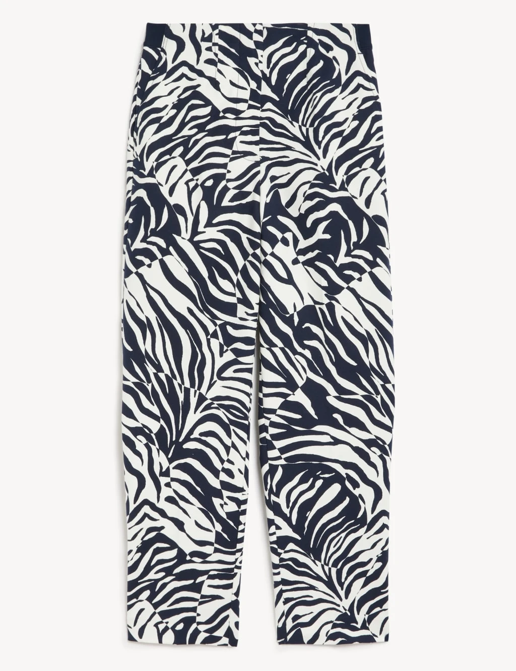 A bold animal print gives these cotton-rich cropped trousers a statement look. The neat slim fit features dart detailing for a tailored look, while added stretch in the fabric offers a flexible feel. Complete with a flattering high waistband with a comfortable elasticated back and handy side pockets.