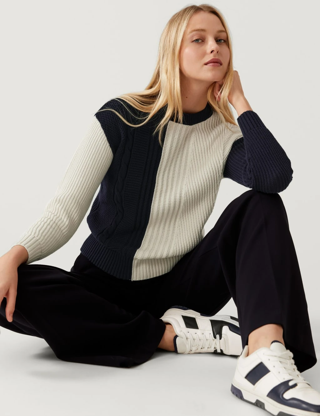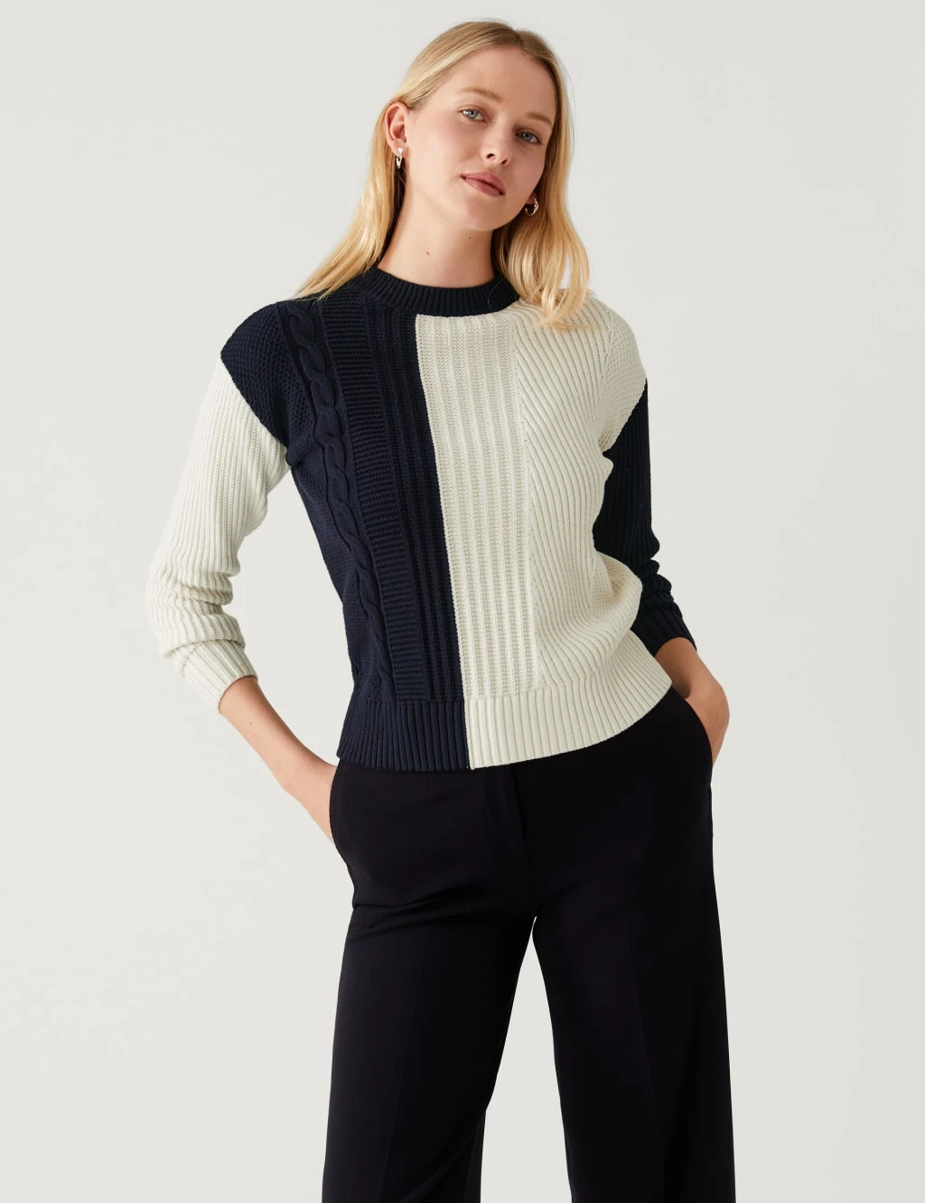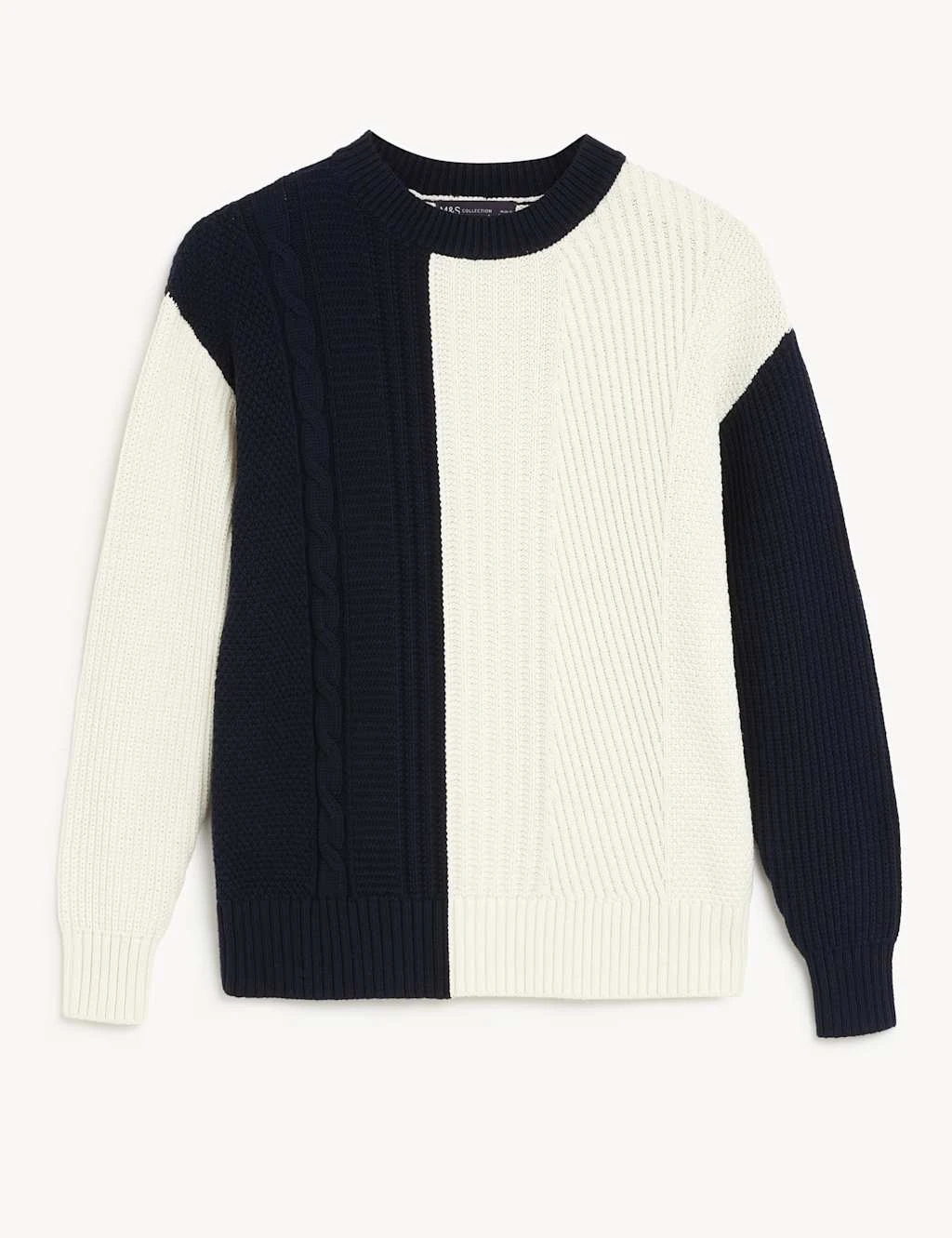 Cosy and eye-catching, this cotton-rich jumper is a wardrobe must. It’s crafted to a relaxed fit with long sleeves and a crew neck. Contrasting textures and asymmetric colour blocks create a stand-out look that’s finished off with ribbed trims.