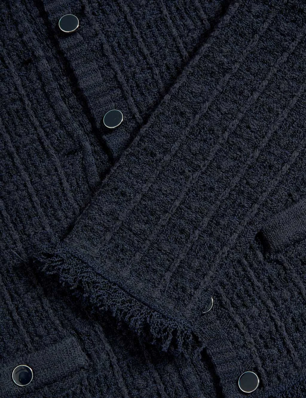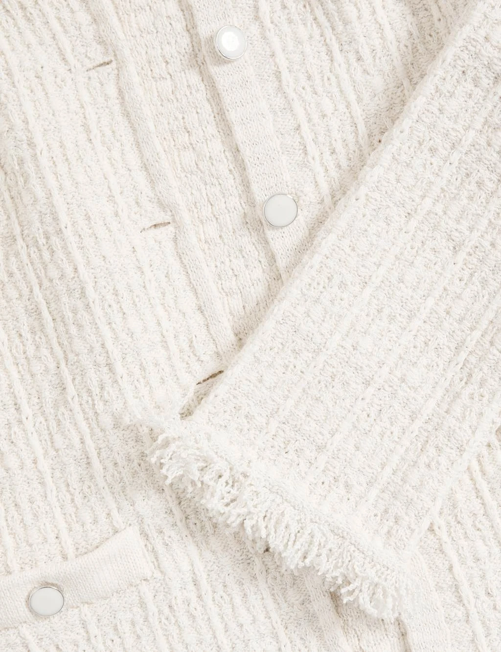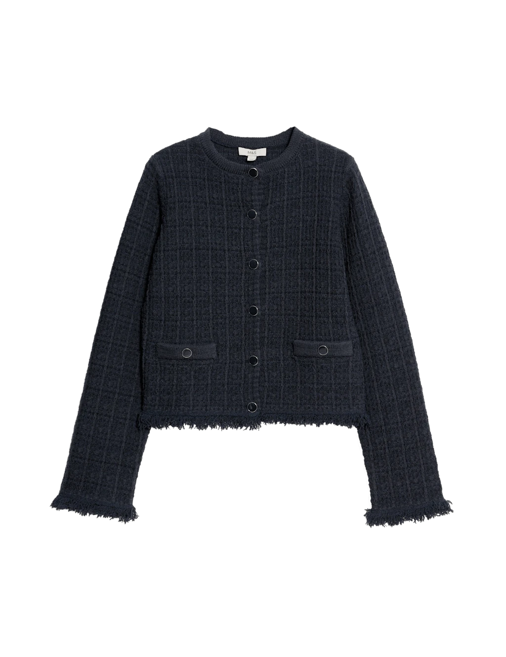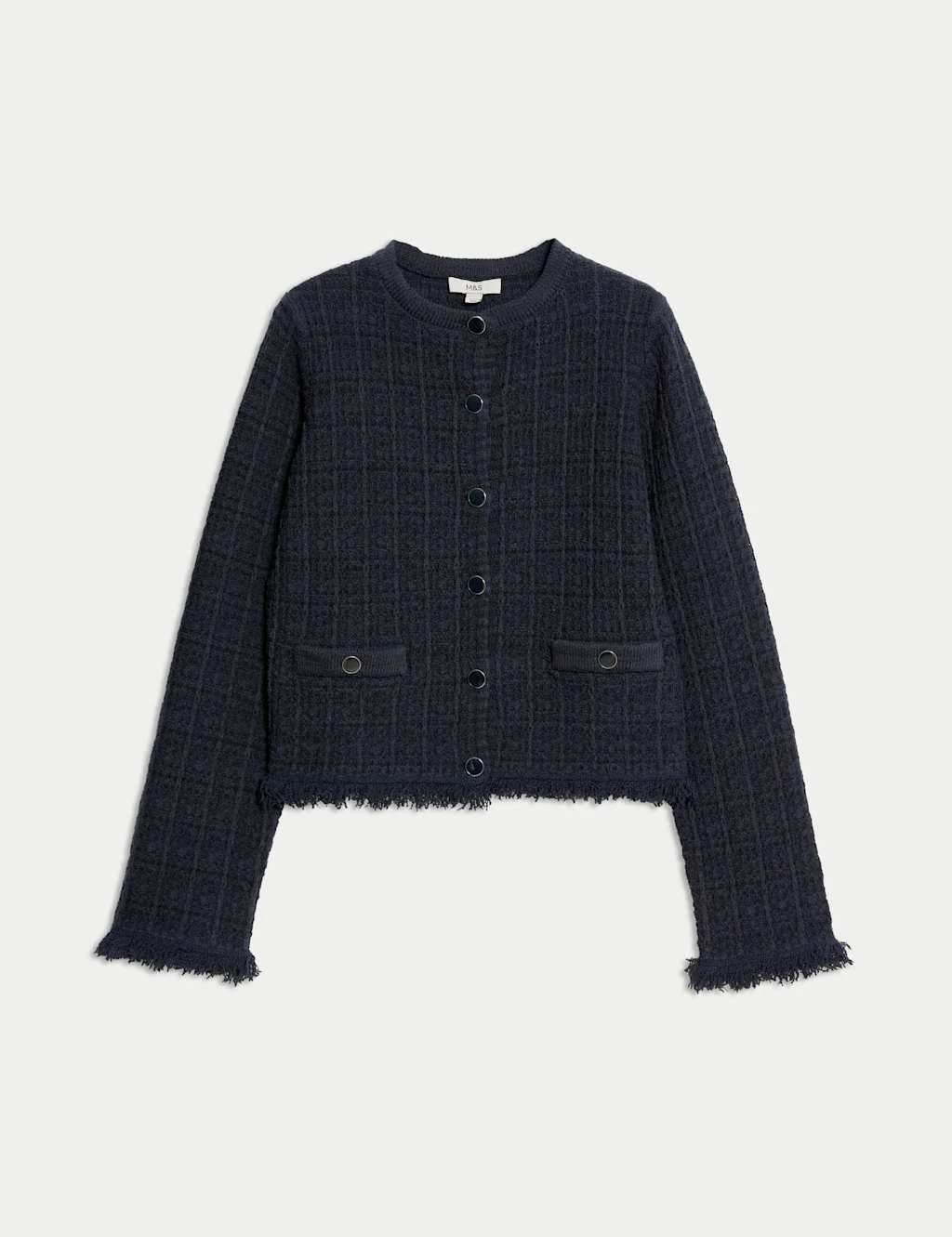 Add a touch of texture to your outfits with this cotton-rich knitted jacket. It’s designed in a regular fit, with a timeless crew neckline and secure button fastenings. The two mock pockets on the front offer a practical touch. Fringe detailing on the hem and cuffs completes the stylish look. M&S Collection: easy-to-wear wardrobe staples that combine classic and contemporary styles.