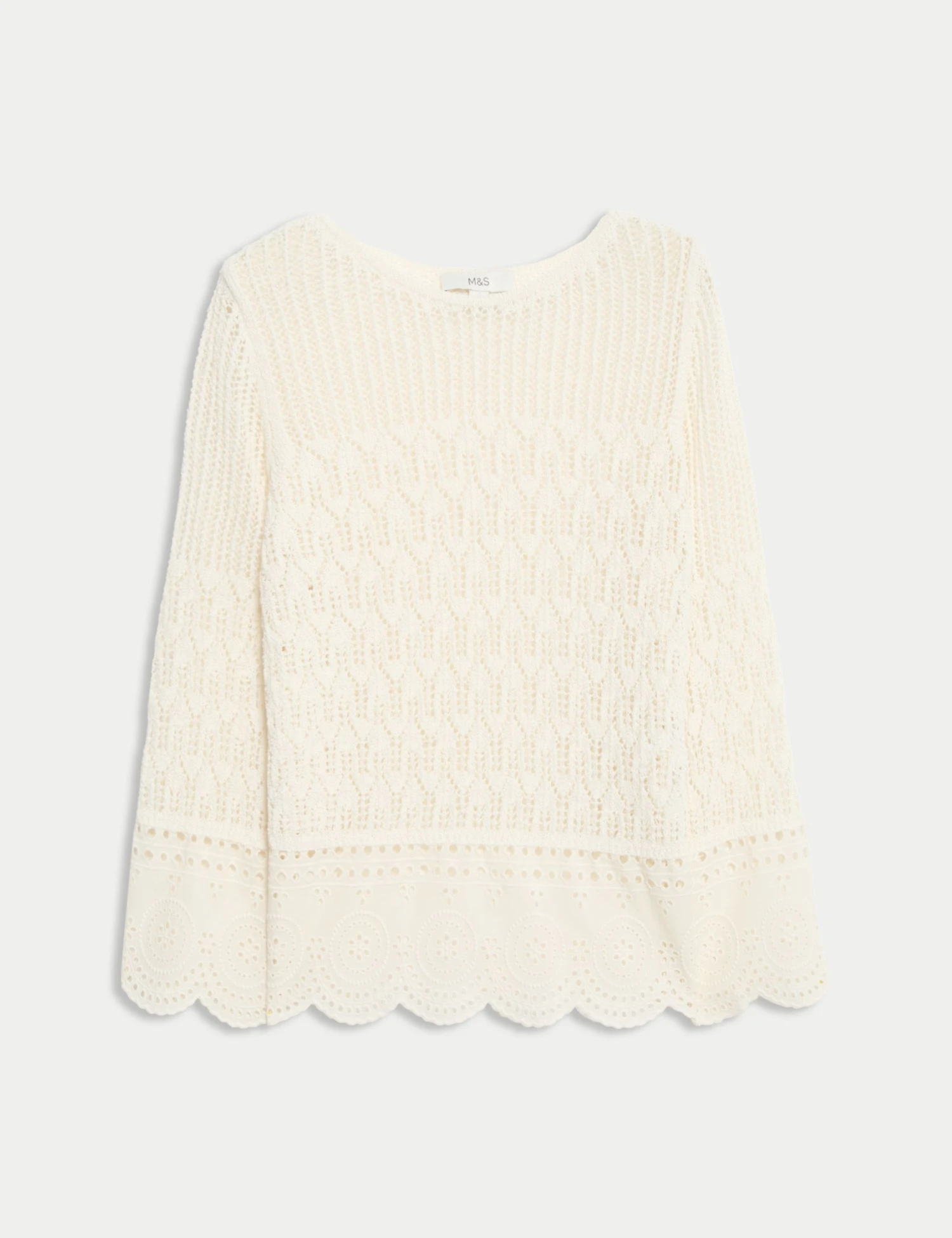 This cotton-rich knitted top is an elegant piece for your wardrobe. It’s designed in a flattering slim fit, with a cropped length and three-quarter sleeves. The crew neckline, cuffs and hem feature a pretty pointelle design, while the body has a delicate textured finish. M&S Collection: easy-to-wear wardrobe staples that combine classic and contemporary styles.