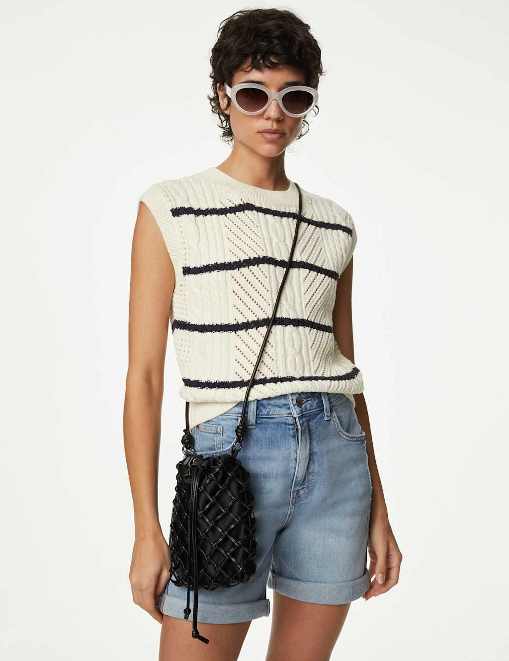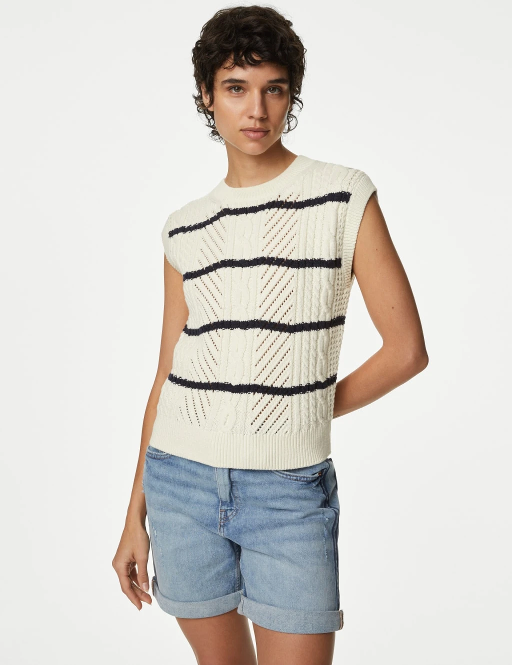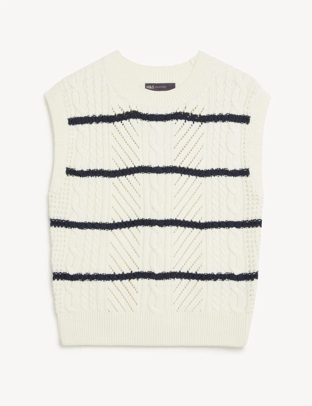 Stripes and cable knit detail make this cotton-rich knitted vest a timeless classic. The sleeveless style has a regular fit and a neat crew neckline. Snug ribbed trims complete the design.