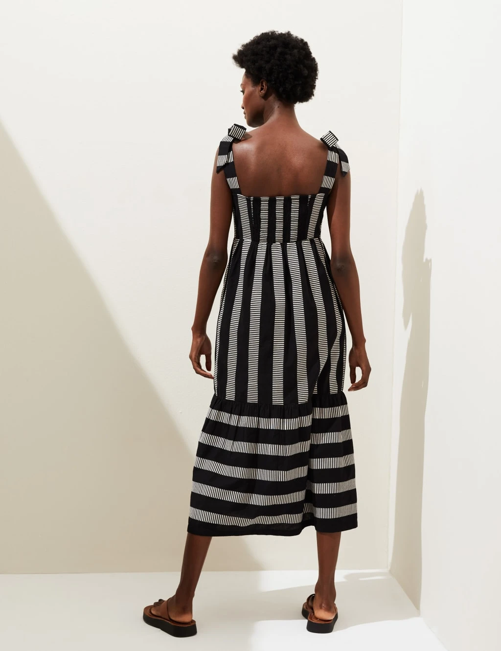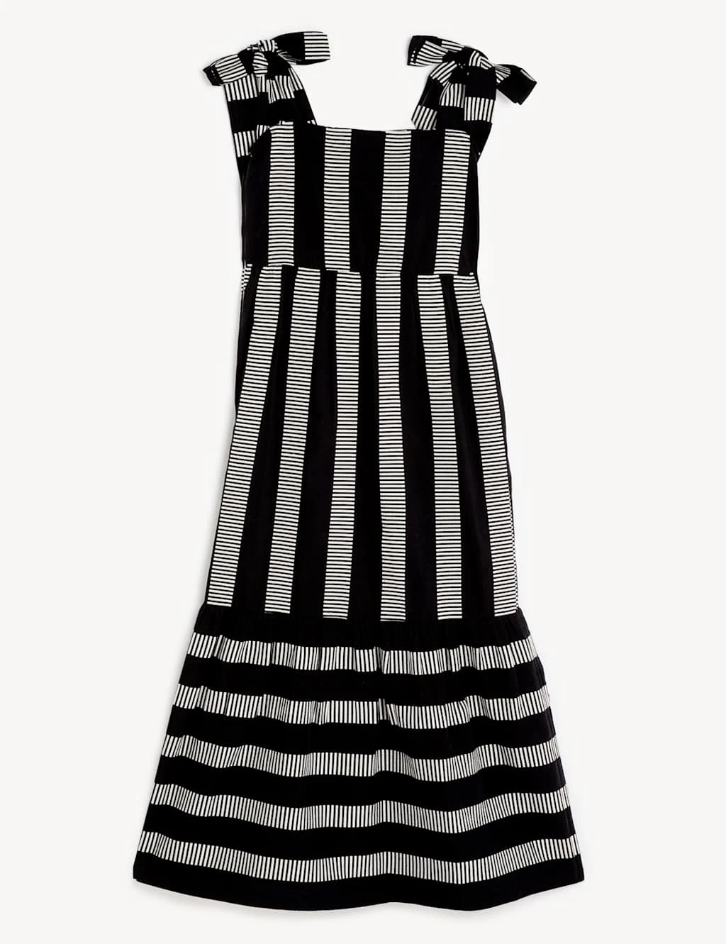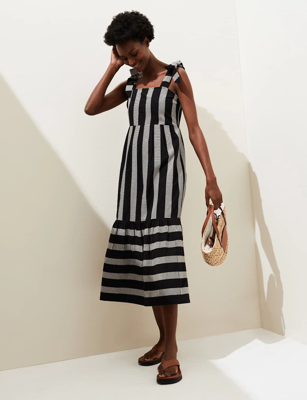 Refresh your summer wardrobe with this cotton-rich midaxi dress. It’s designed in an easy regular fit with a flowing tiered silhouette. A square neck and tie straps give a contemporary feel. The dress is patterned with multi-directional stripes for a statement finish.