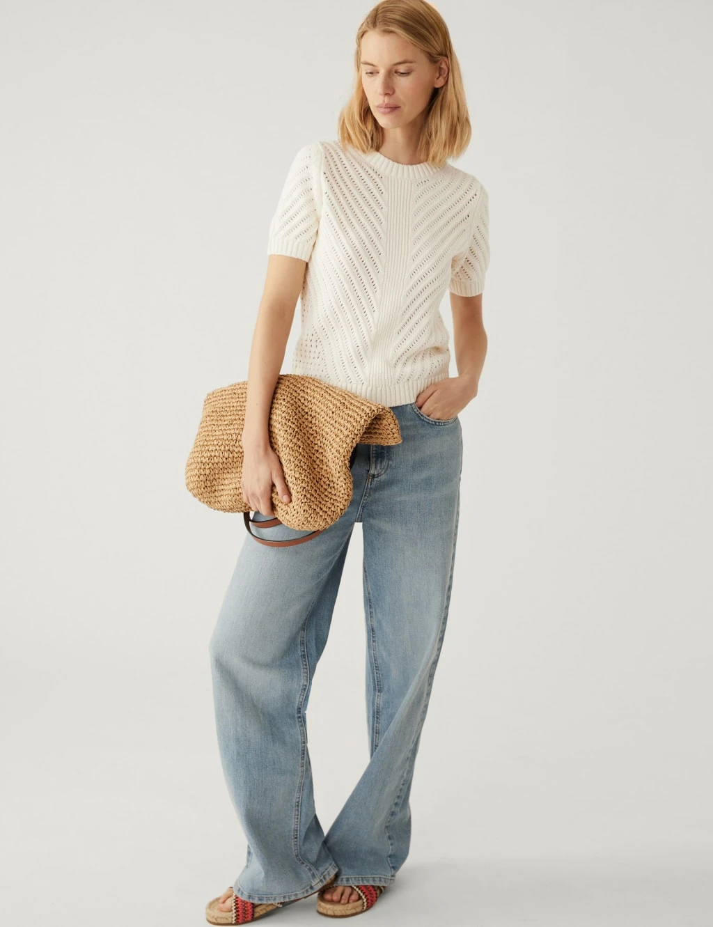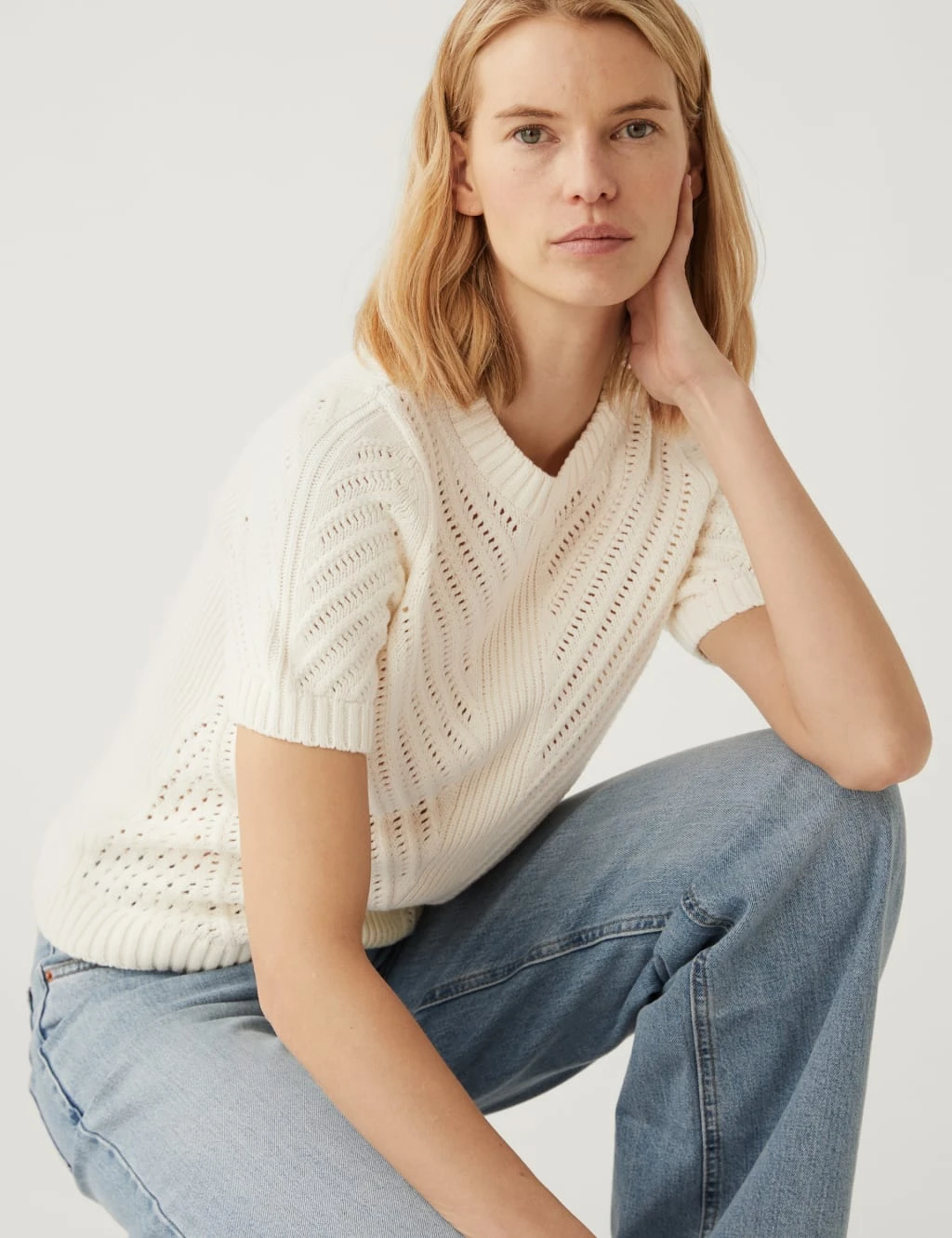 Directional pointelle stitching adds textural interest to this cotton-rich knitted top. It’s designed in a regular fit and features airy short sleeves. Ribbed trims on the cuffs, crew neckline and hem lend subtle structure to its shape.