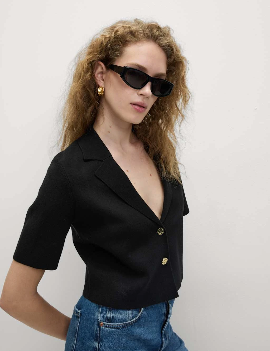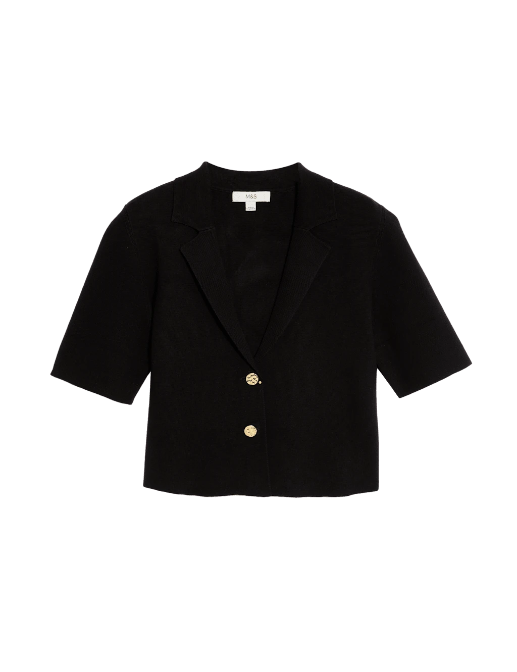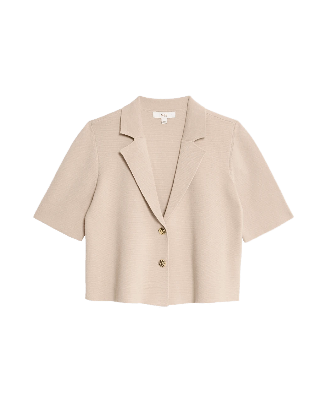 Elevate your smart-casual wardrobe with this effortlessly stylish cotton-rich knitted blazer. It’s designed in a comfortable regular fit with a cropped length, perfect for layering. A button-up front and two handy pockets add both polish and practicality, while the short sleeves and v-neckline create a sleek, modern silhouette. M&S Collection: easy-to-wear wardrobe staples that combine classic and contemporary styles.