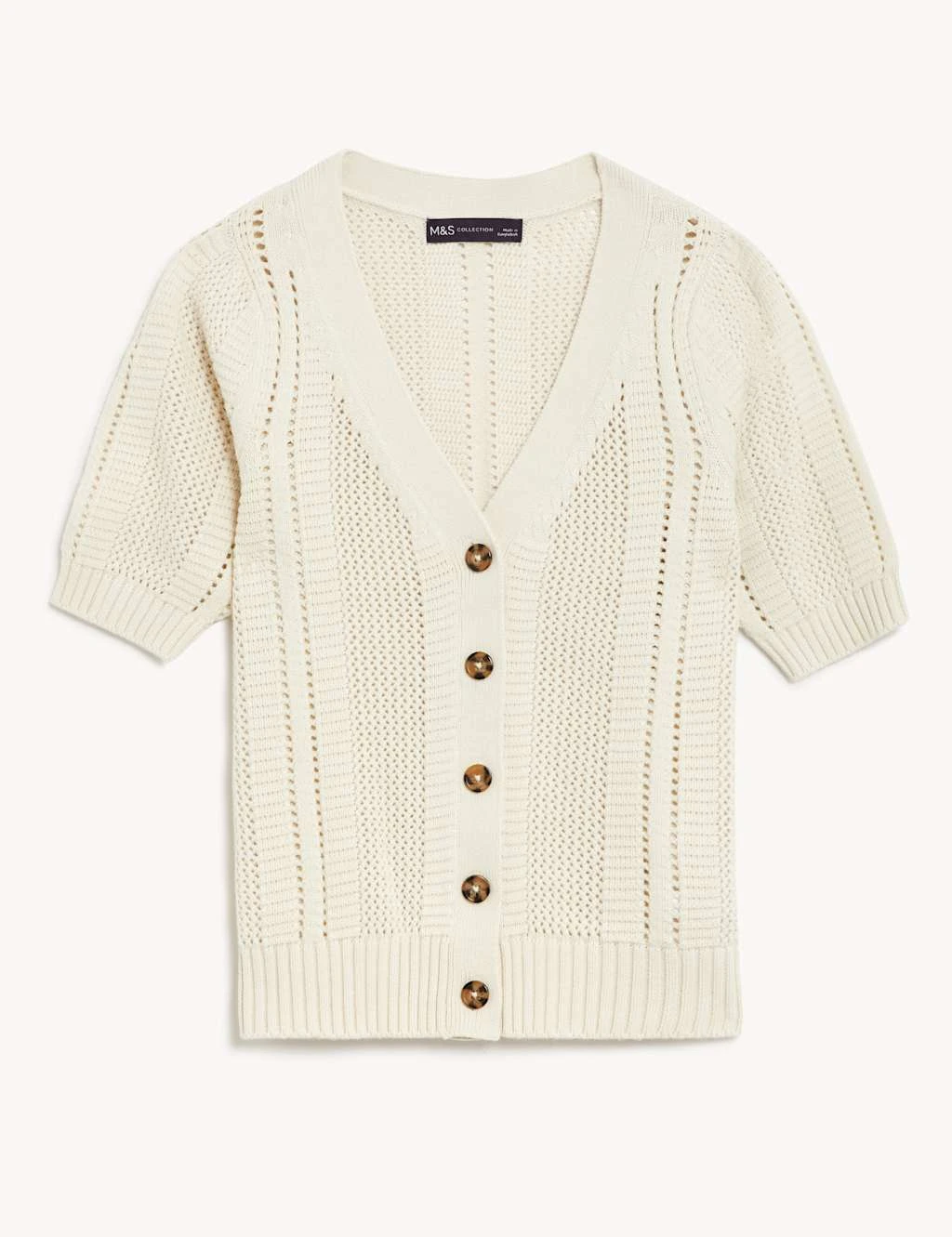 A textured knit adds a premium feel to this cotton-rich cardigan. It’s designed in a regular fit, with short sleeves and a v-neck for a flattering silhouette. Tortoiseshell-style buttons give a timeless finish. M&S Collection: easy-to-wear wardrobe staples that combine classic and contemporary styles.