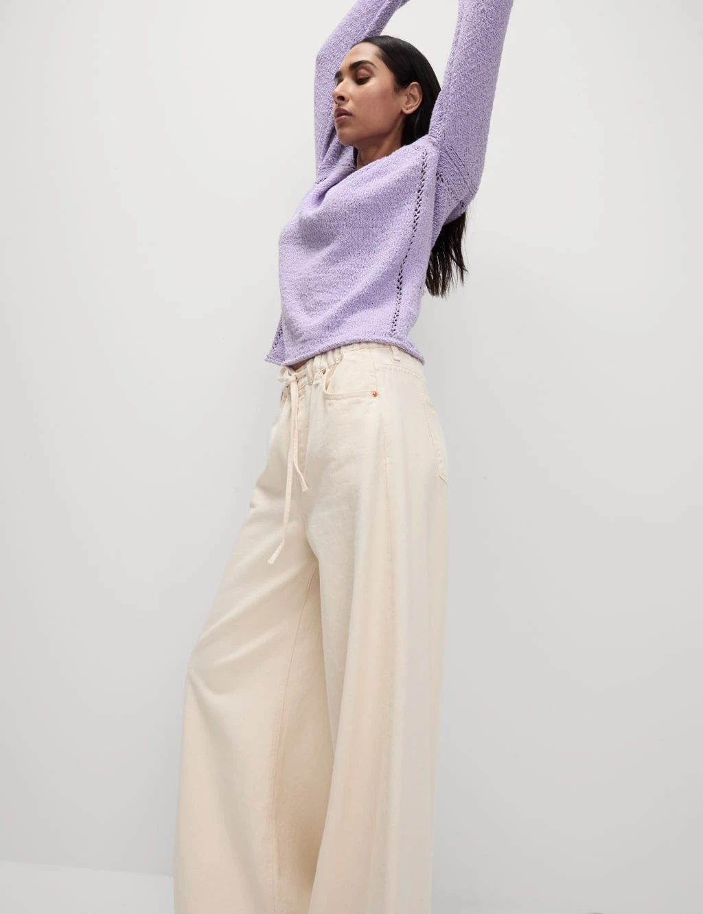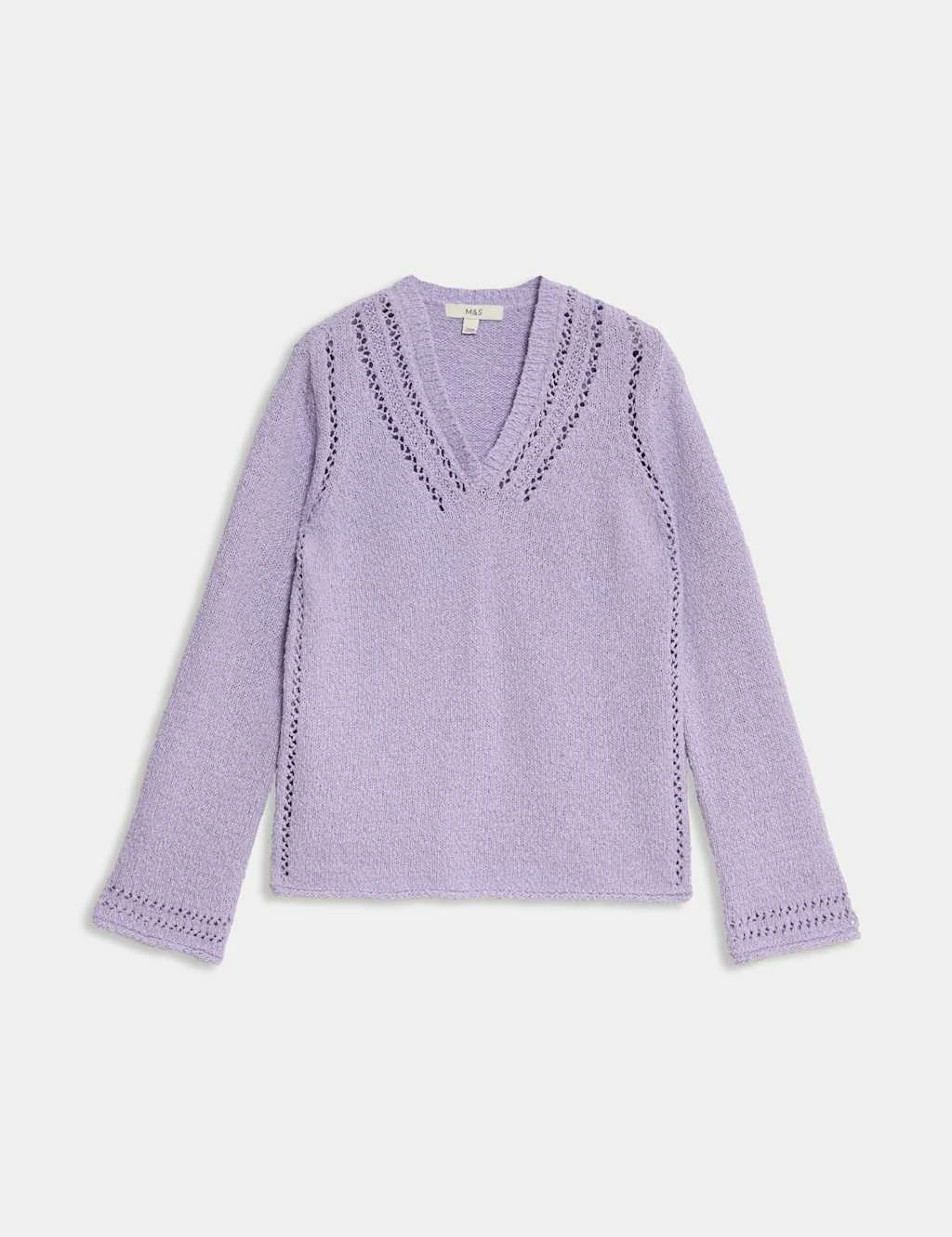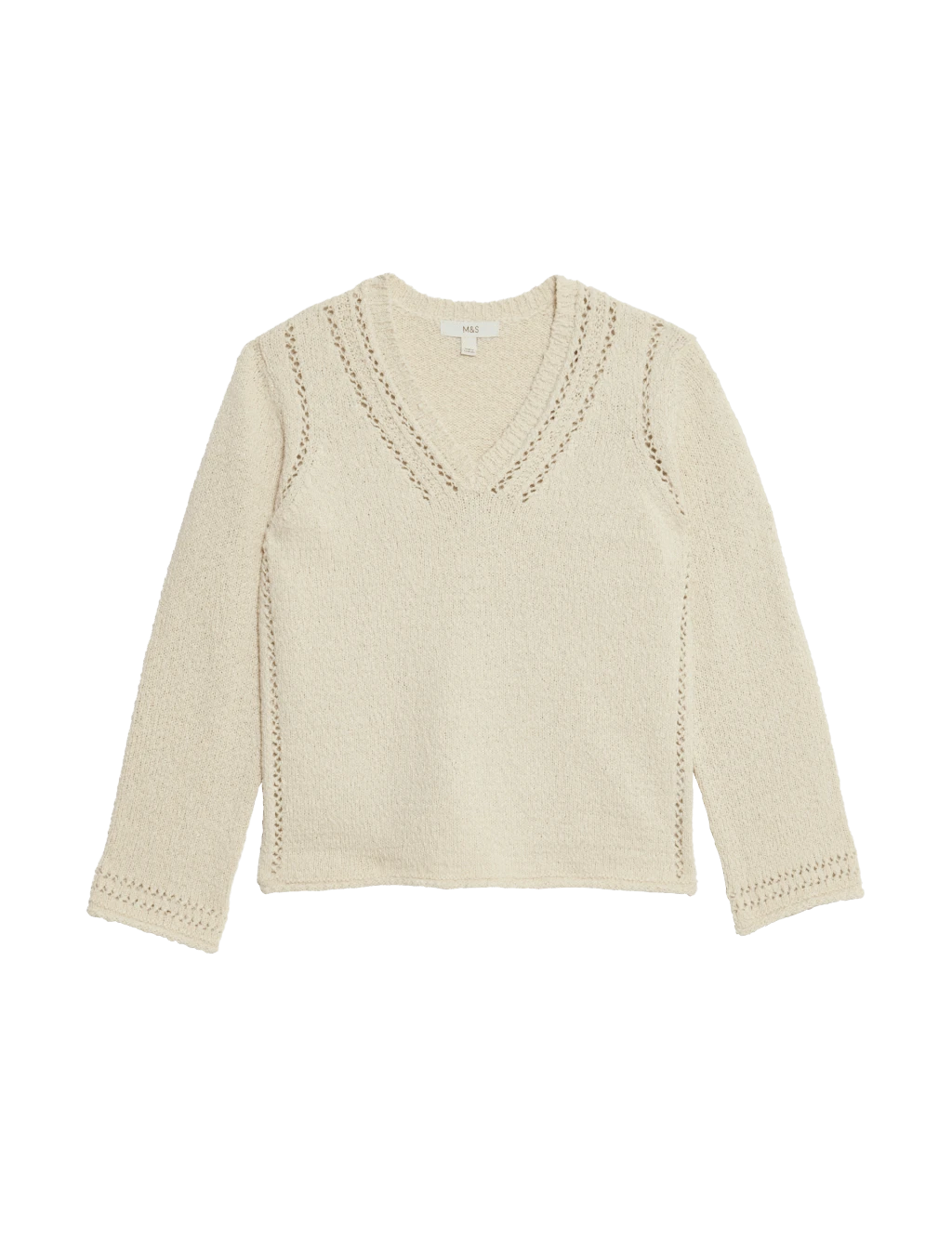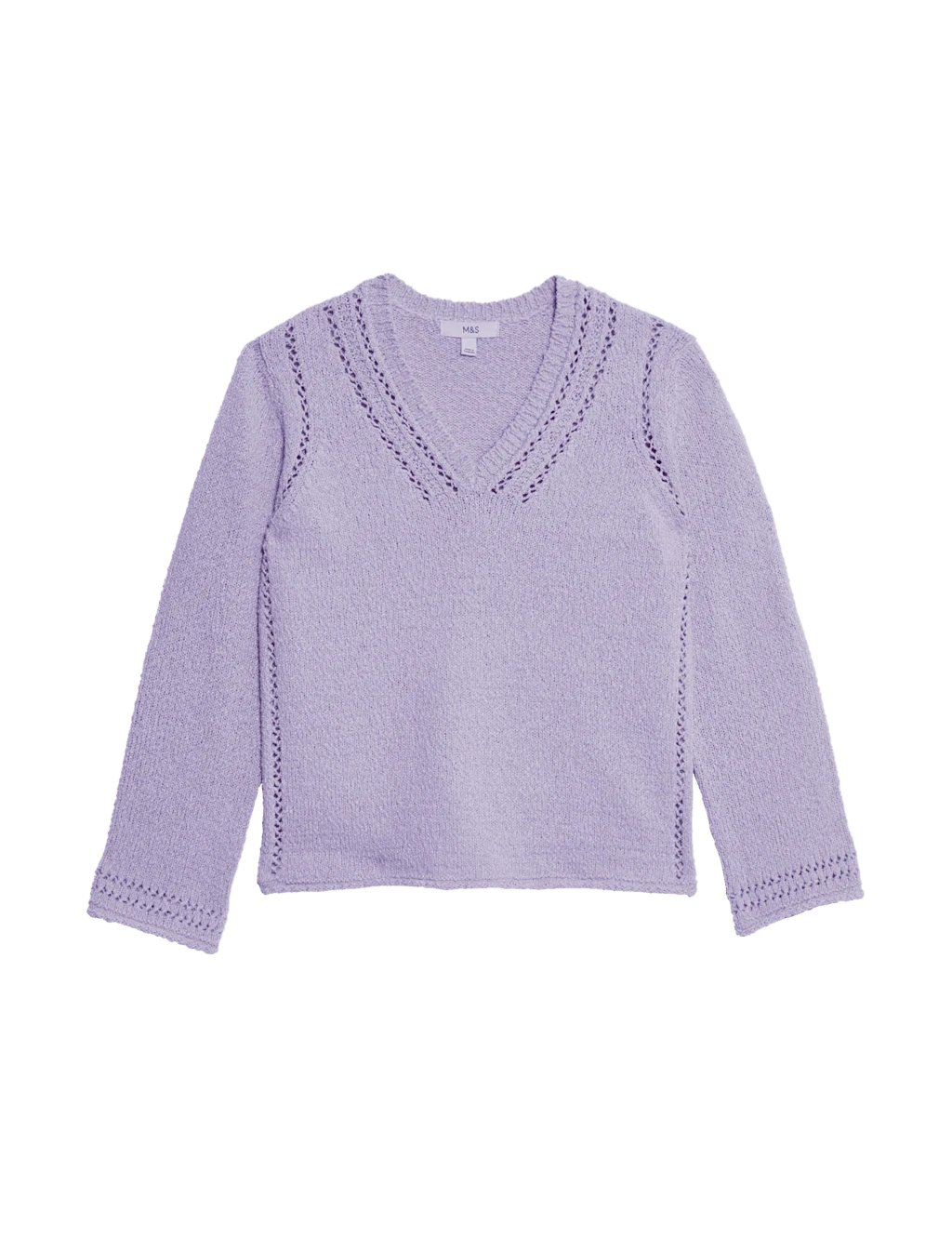 Ladder stitching lends a delicate touch to this cotton-rich jumper. It’s designed in a regular fit, with a stylish v-neckline. The slub yarn gives a textured effect, while rolled hems and cuffs add a casual finish.M&S Collection: easy-to-wear wardrobe staples that combine classic and contemporary styles.