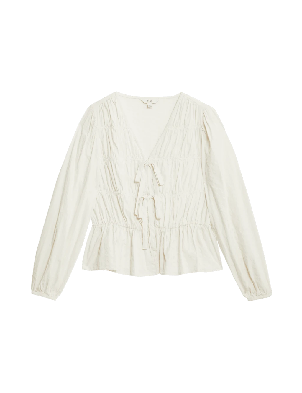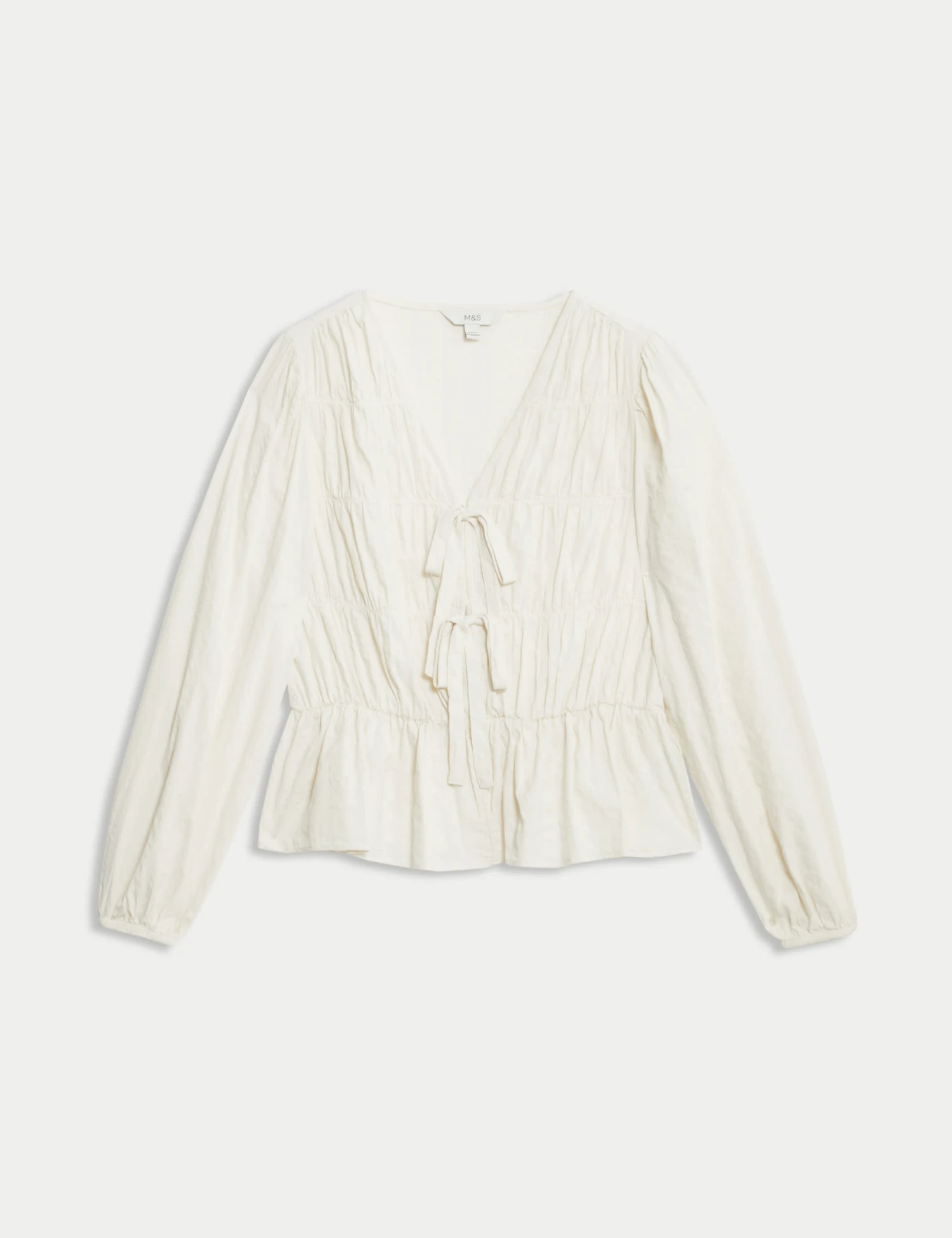 Add effortless charm to your wardrobe with this cotton-rich blouse. Designed in a regular fit, it features a flattering v-neckline for a timeless look. The tie fastening at the front adds a stylish, refined touch. M&S Collection: easy-to-wear wardrobe staples that combine classic and contemporary styles.