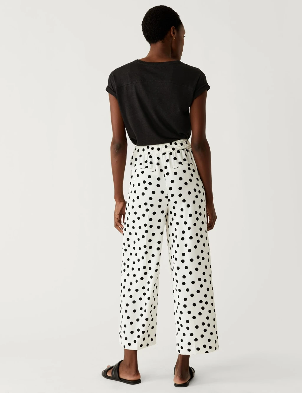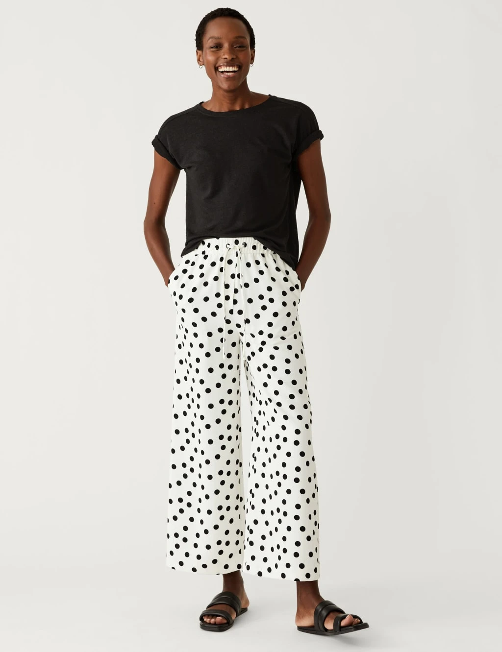 You’ll go dotty for these polka dot trousers. They’re crafted with breezy wide legs, two mock pockets on the back and two concealed pockets on the side to add practicality. Featuring a high waist with a neat drawstring fastening and a fully elasticated waistband for comfort. M&S Collection: easy-to-wear wardrobe staples that combine classic and contemporary styles.