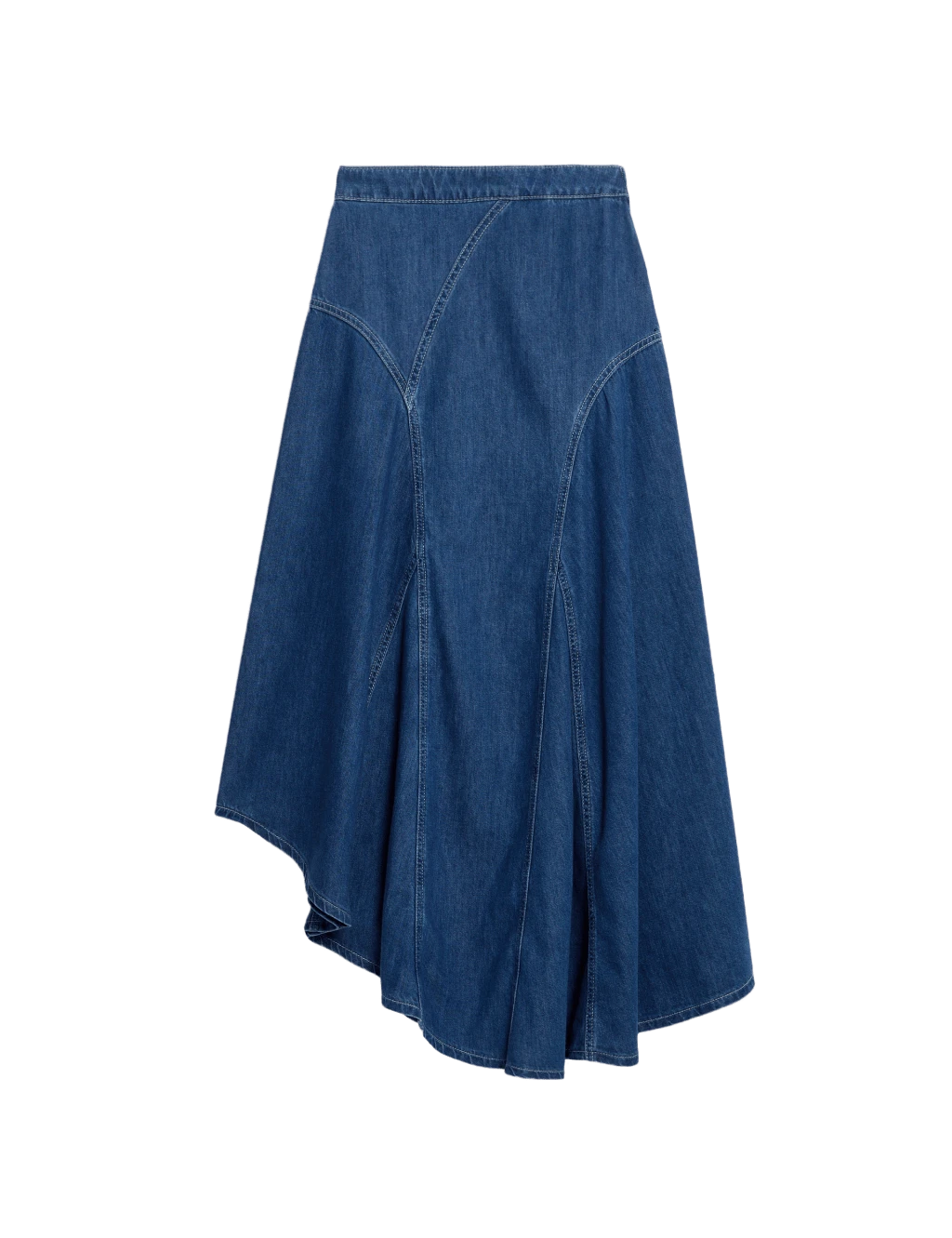This pure cotton denim skirt is a modern take on a timeless style. The flattering piece is designed with asymmetric panels that create swishy volume and graceful folds falling to a maxi length. A zip fastening at the high waist provides a neat finish. M&S Collection: easy-to-wear wardrobe staples that combine classic and contemporary styles.