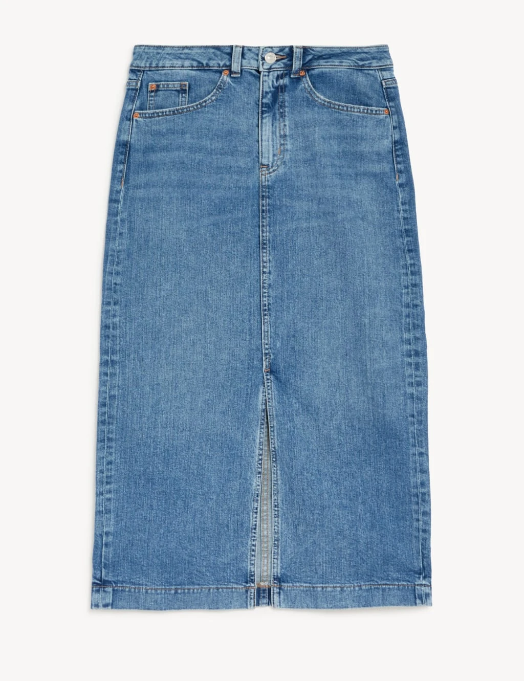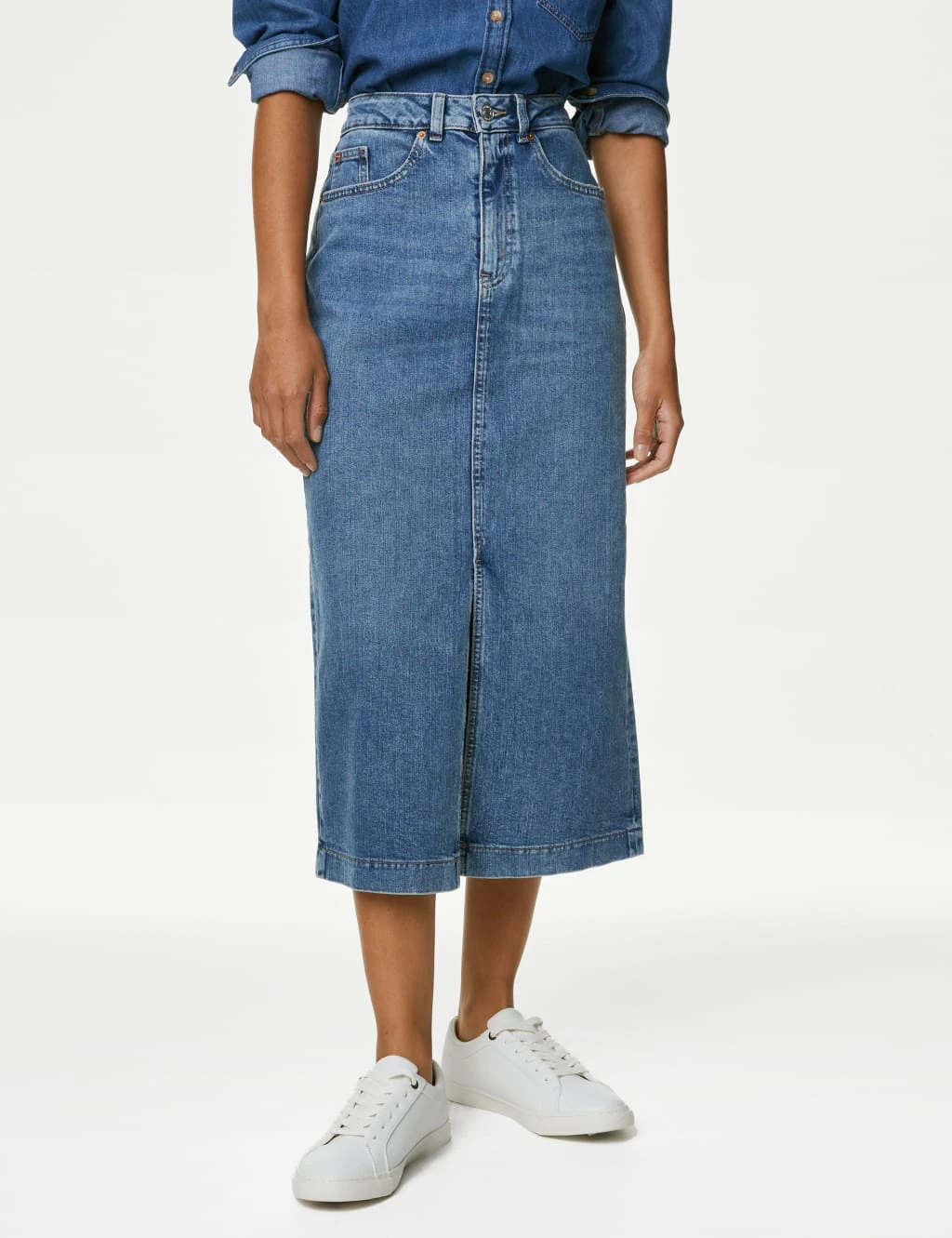Update your denim collection with this cotton-rich midi skirt. The classic five-pocket design has a flattering high waist with a button-and-zip fastening. A touch of stretch in the fabric and a split opening at the front ensure easy movement.