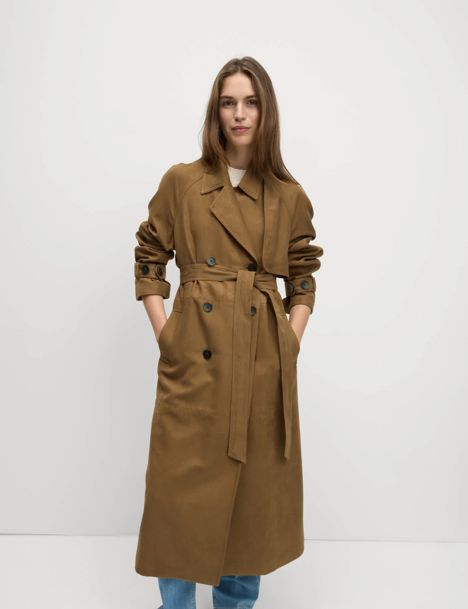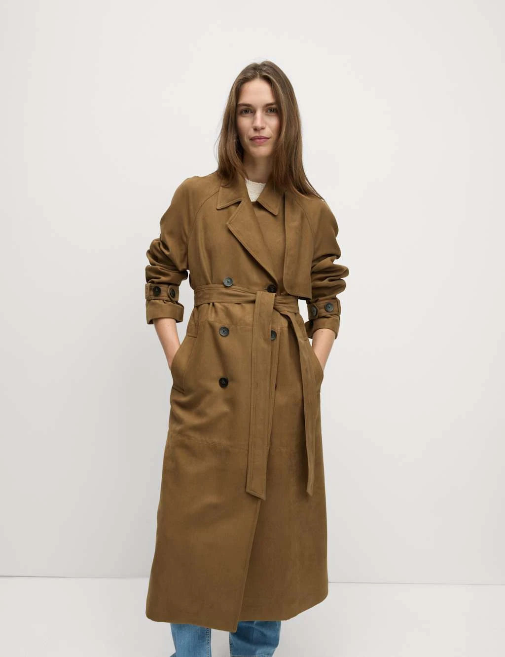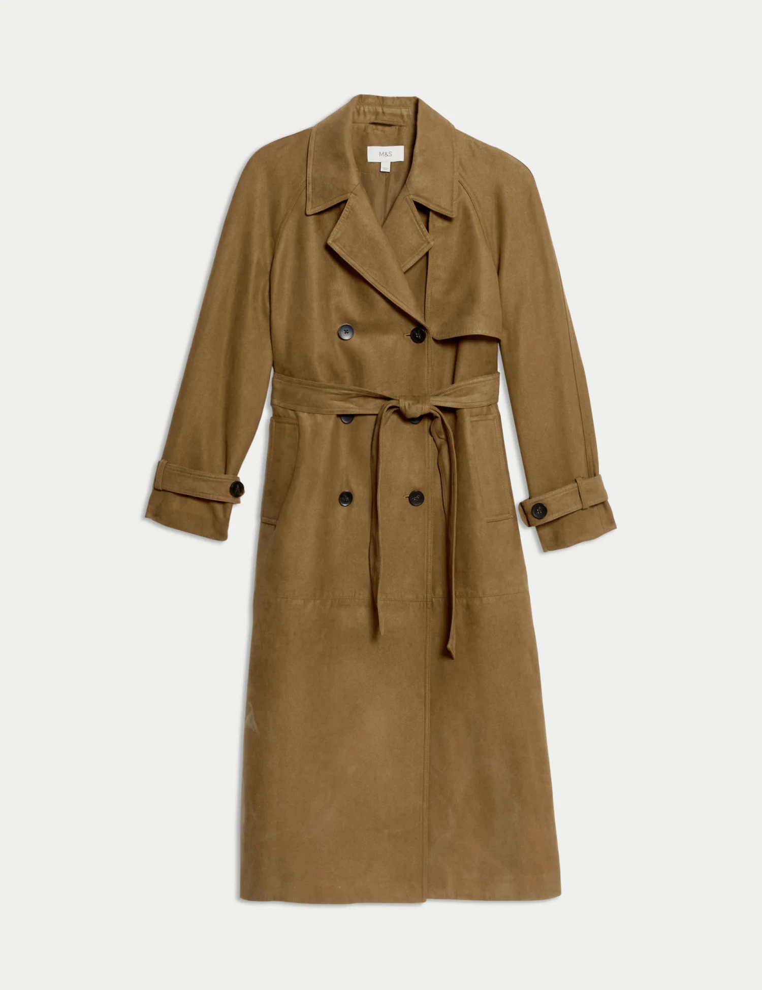 Effortlessly stylish, this suedette trench coat is a chic layer for cooler days. It’s cut in a relaxed fit, with a detachable belt so you can wear it loose or cinched at the waist. Classic details like the double-breasted front and storm flaps bring timeless appeal. Finished with buttoned cuffs and handy side pockets for everyday practicality. M&S Collection: easy-to-wear wardrobe staples that combine classic and contemporary styles.
