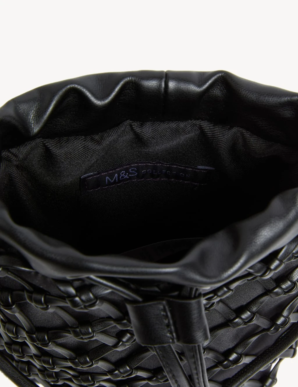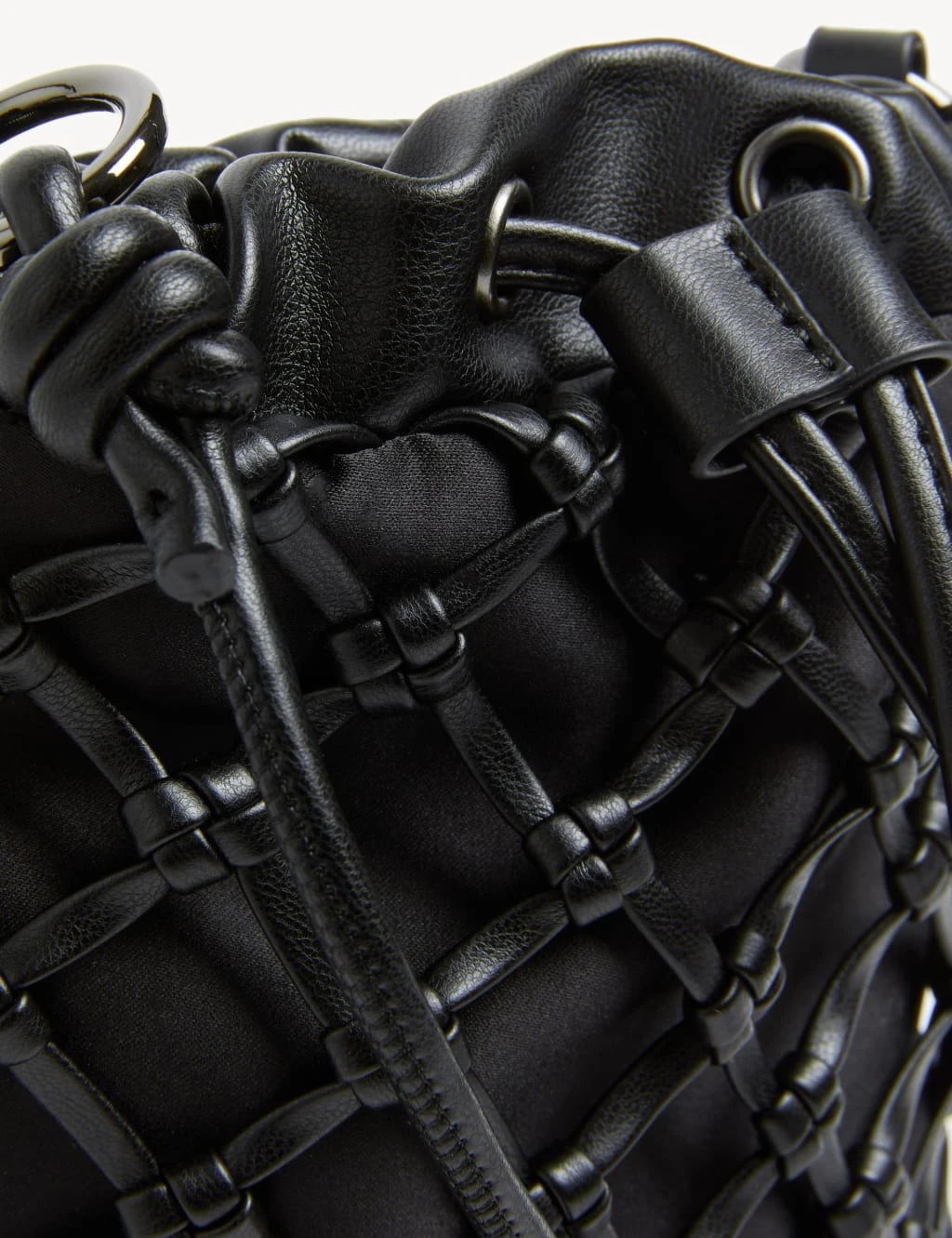 This soft cross-body bag features an eye-catching rope lattice design. The main compartment is fully lined and closes with a handy drawstring. An adjustable strap features hand-knotted details and smart metallic fixings.