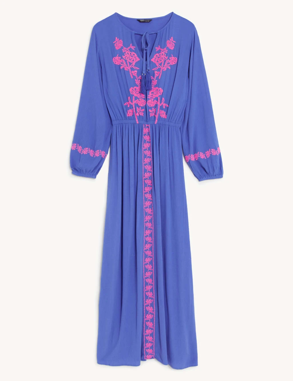 This beach dress is embroidered for a feminine flourish. It’s crafted in a regular fit, with long blouson sleeves and a maxi hem giving extended coverage. An elasticated waist offers a flattering shape, while a tassel tie at the v-neck creates a playful pop.