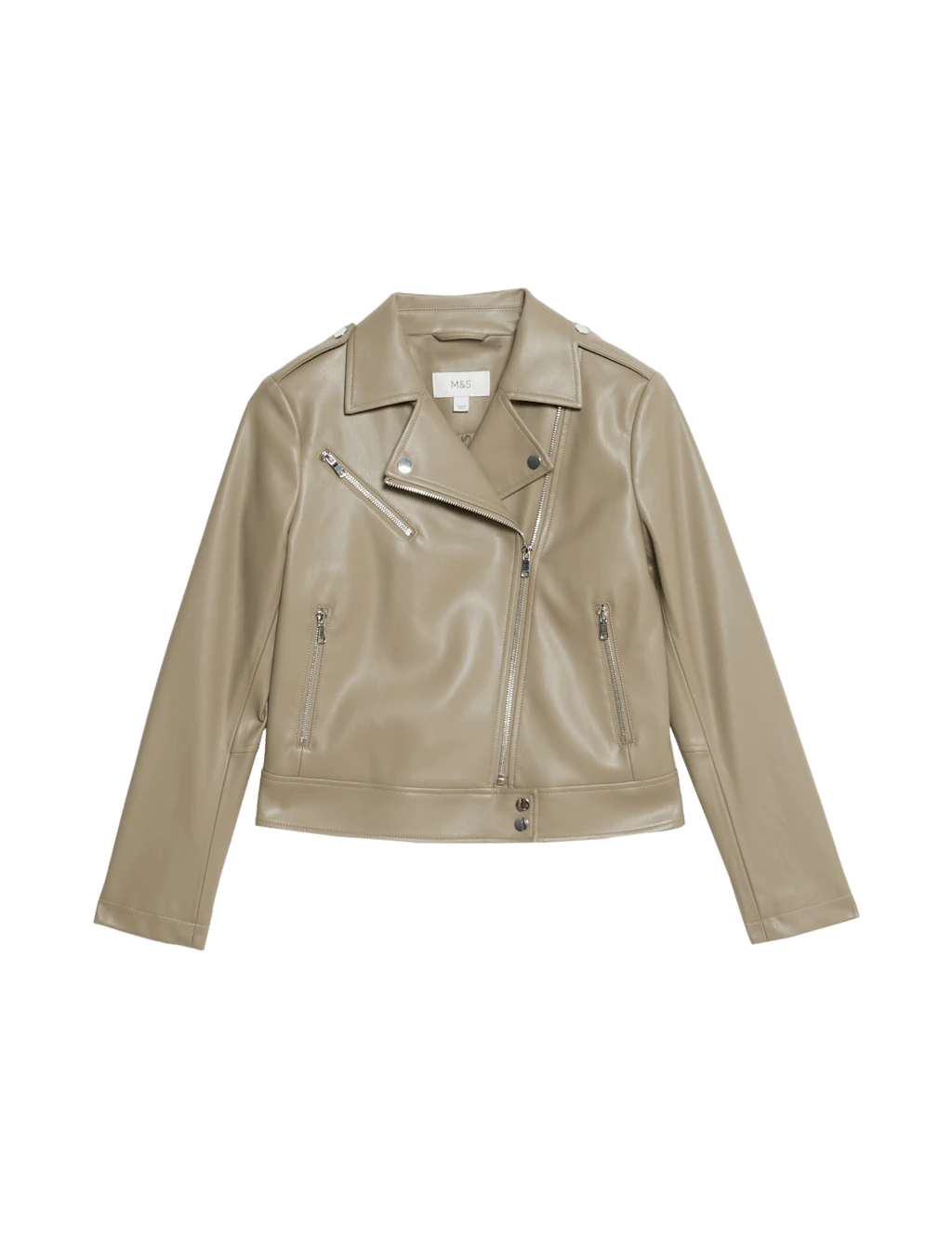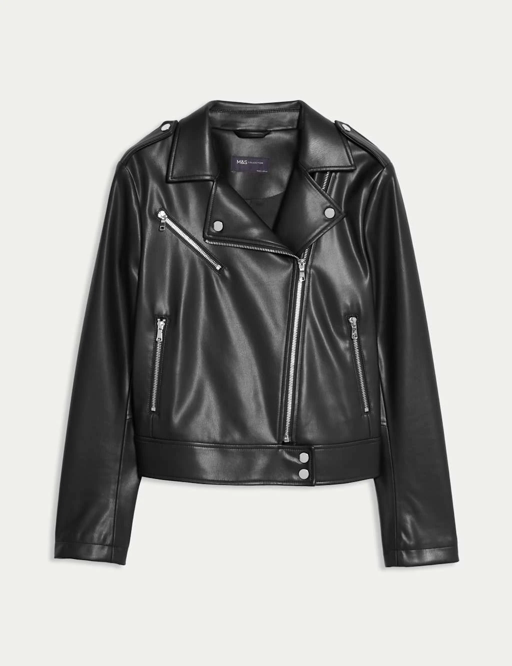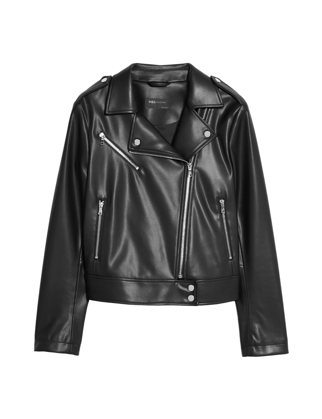 This jacket is crafted from supple faux leather for a contemporary biker look. It’s cut in a boxy regular fit, with epaulettes and an off-centre zip adding authentic styling. Poppers fasten the collar and waistband, while two zipped pockets provide a secure space for your belongings. This piece is complete with a full lining for a smooth feel. M&S Collection: easy-to-wear wardrobe staples that combine classic and contemporary styles.