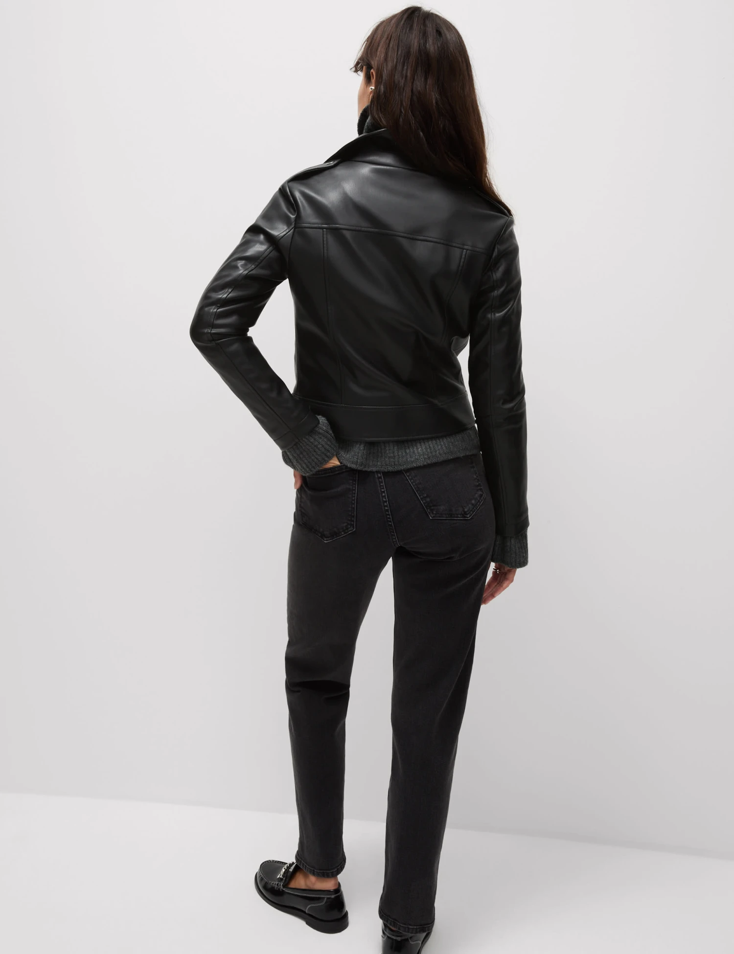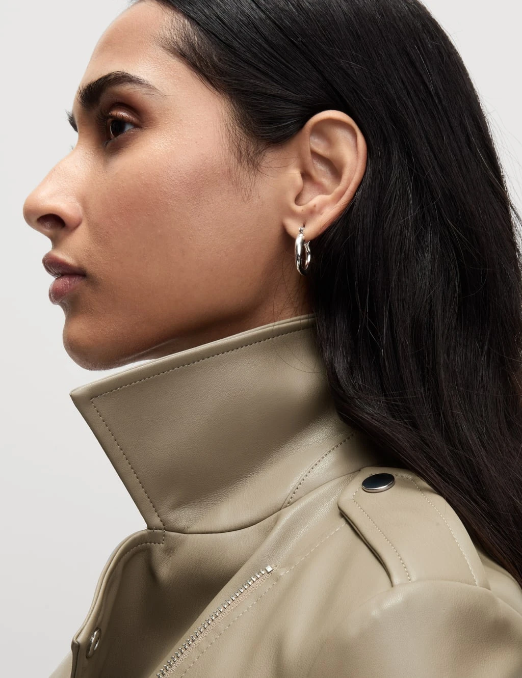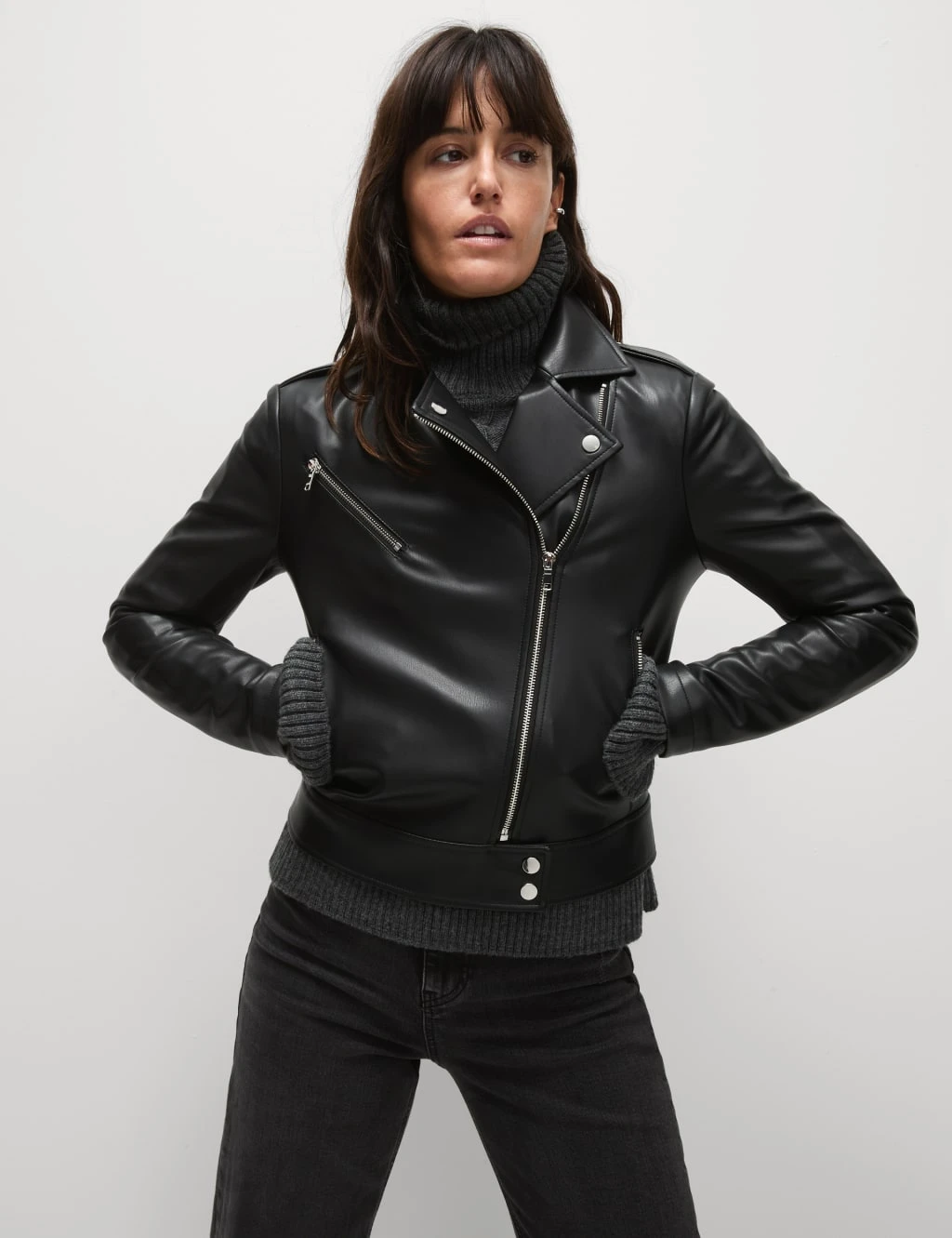 This jacket is crafted from supple faux leather for a contemporary biker look. It’s cut in a boxy regular fit, with epaulettes and an off-centre zip adding authentic styling. Poppers fasten the collar and waistband, while two zipped pockets provide a secure space for your belongings. This piece is complete with a full lining for a smooth feel. M&S Collection: easy-to-wear wardrobe staples that combine classic and contemporary styles.