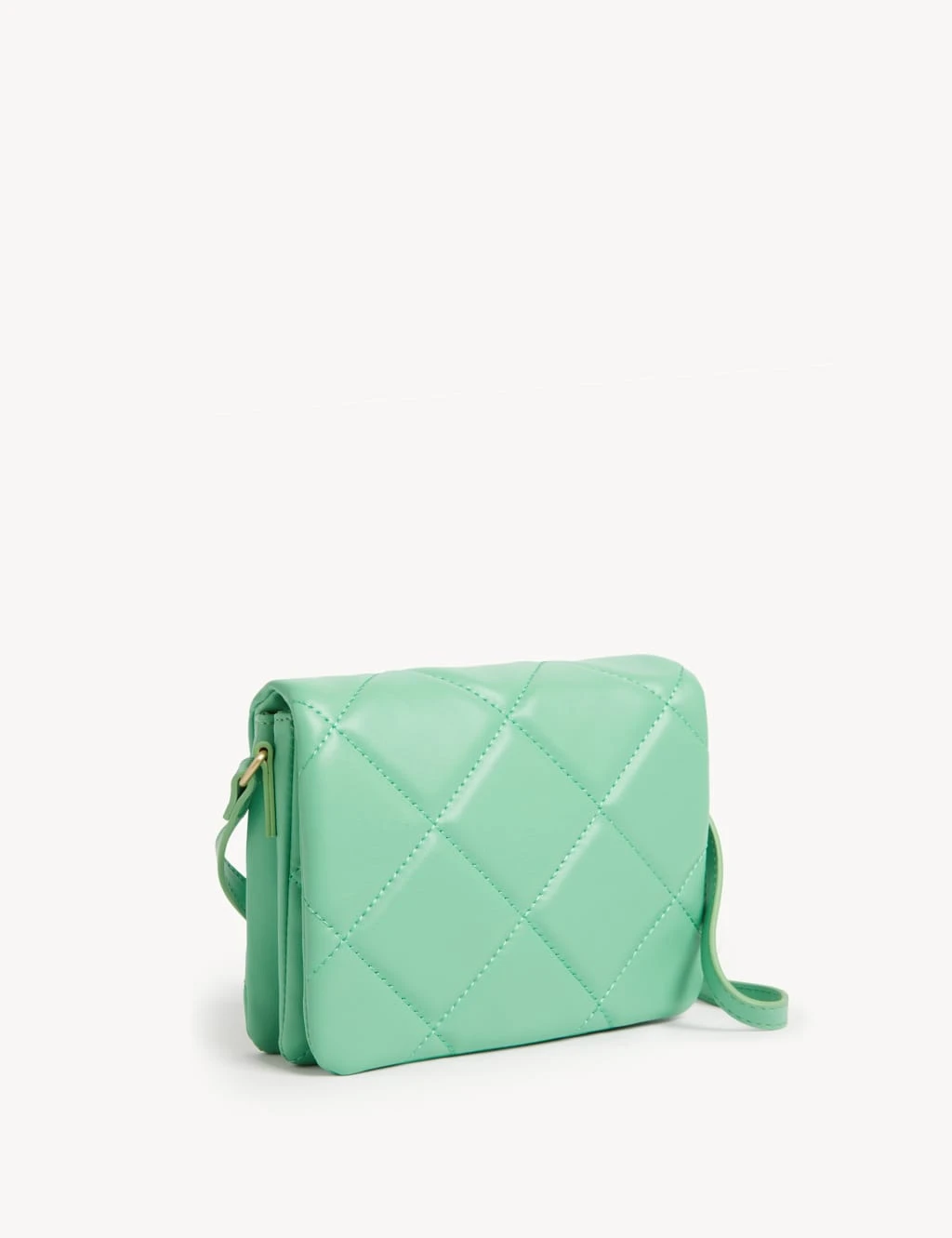 Soft faux leather in a quilted style gives this mini bag a luxurious look. It features two internal compartments and a flap-over front with magnet fastening for easy closure. Inside, a zipped pocket and slip pocket keep your essentials safe. Brushed gold-tone hardware on the detachable cross-body strap. Made with recycled polyester lining.