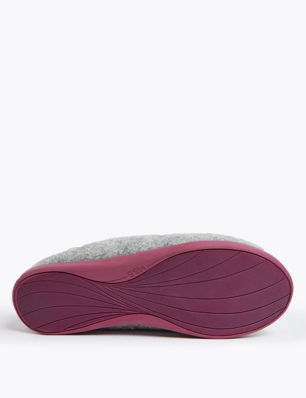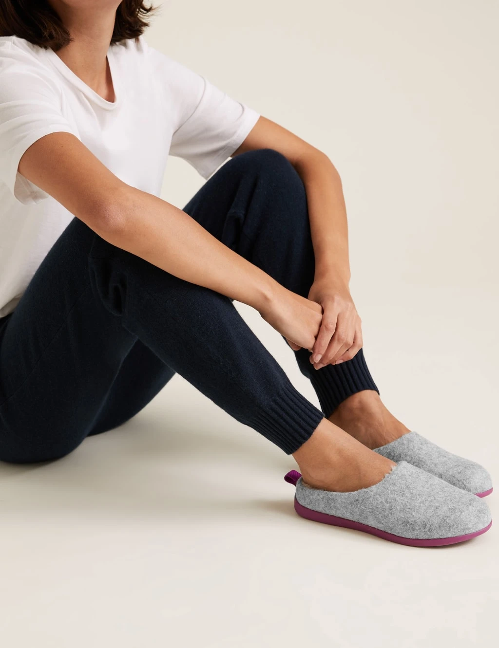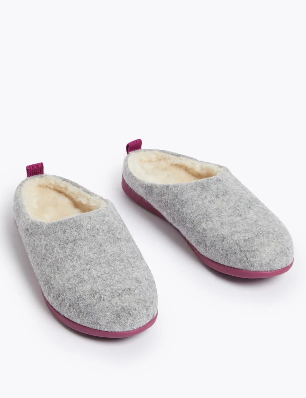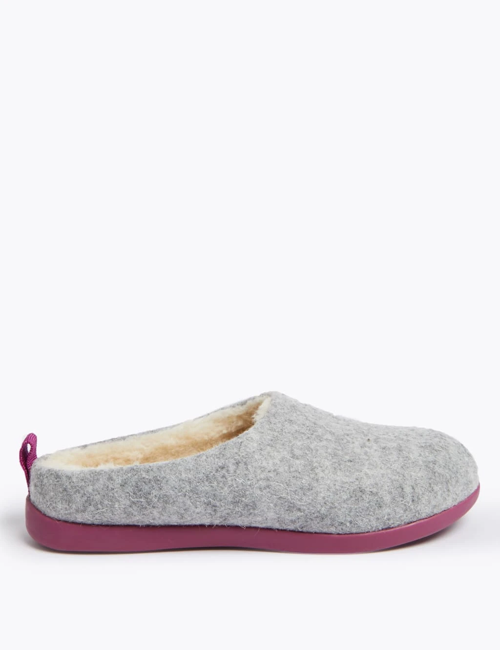Lounge around in these soft felt slippers. Slip-on mule style with a cosy faux fur lining to keep your toes warm. Secret Support technology provides ultimate comfort, thanks to a hidden arch that cleverly moulds to the shape of your feet. This product is vegan.