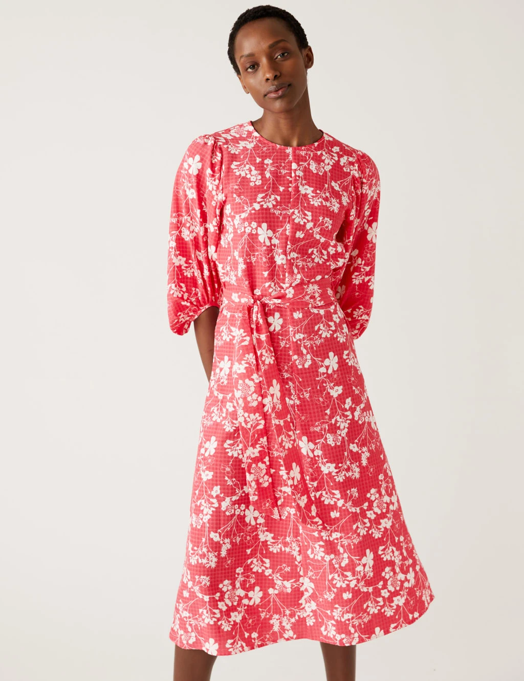 The feminine details on this midaxi dress give the design a classically elegant feel. It’s crafted to a regular fit, with added stretch for comfort and a modest round neck. The piece fastens with a neat zip at the back and features voluminous, three-quarter length sleeves. It’s finished with a flattering belted waist and floral print.