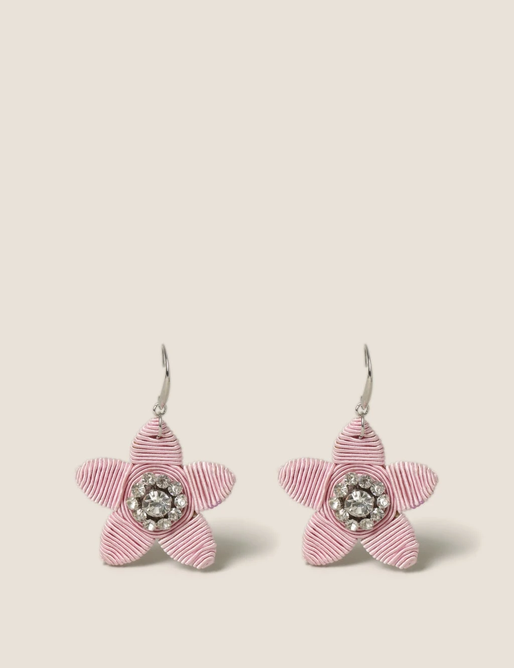 These pink fabric wrapped earrings sit in the shape of a traditional flower. This is finished of with a silver faux stone centre of small entrusted stones on a fish hook style earring.