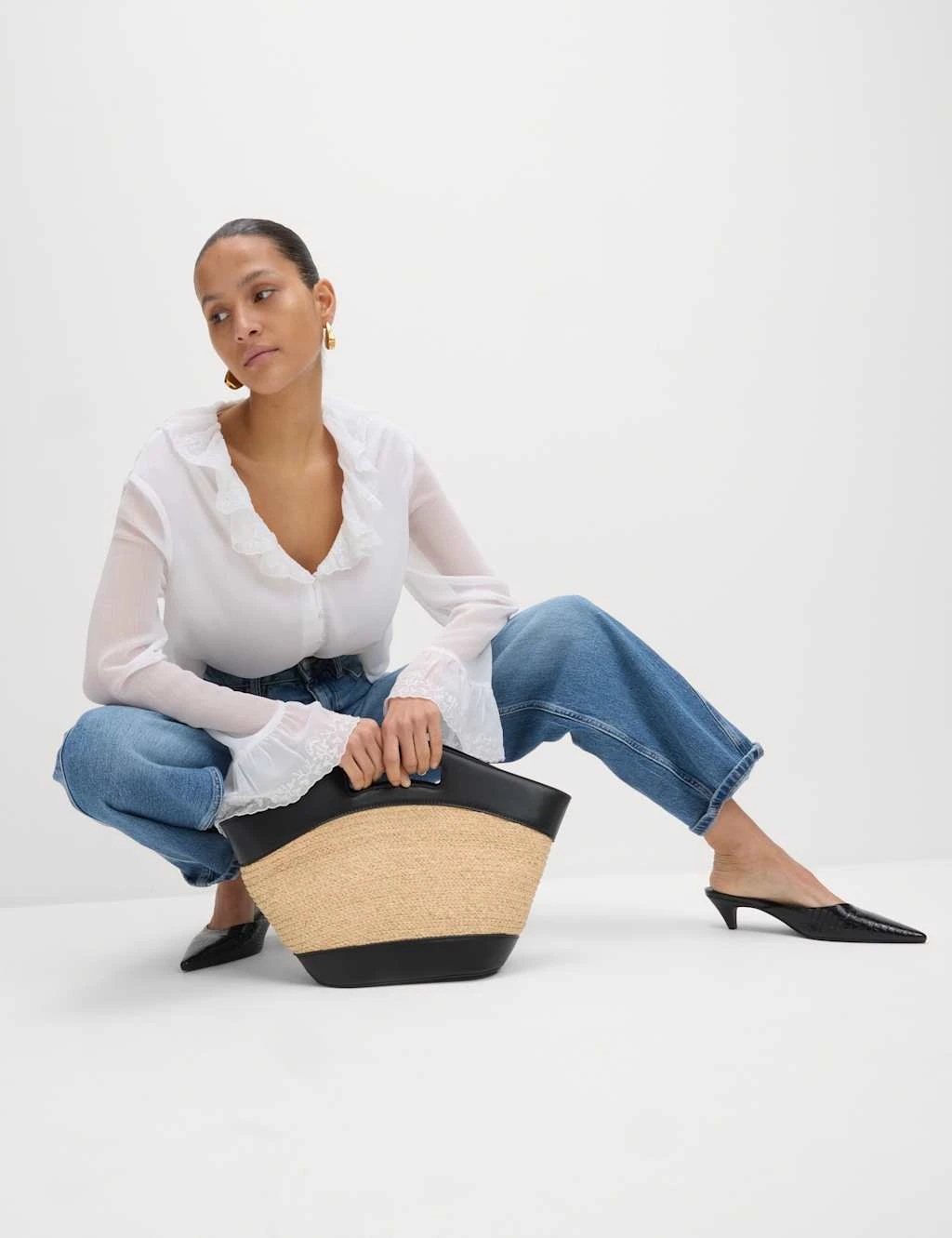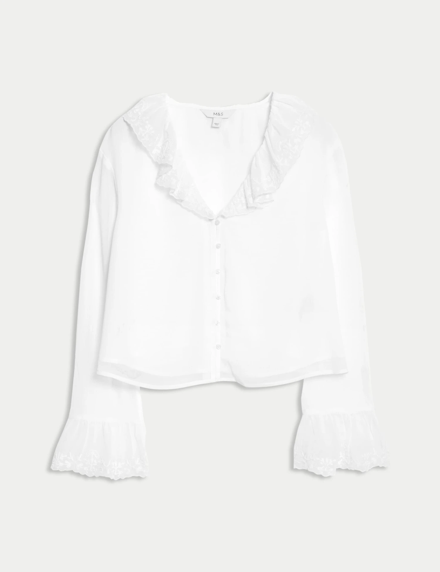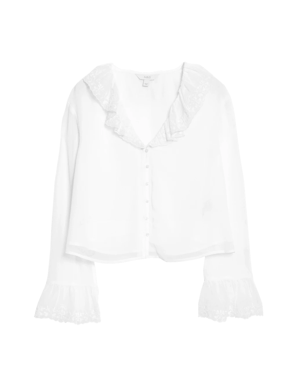 With its frilly broderie collar and cuffs, this super-pretty blouse is a standout addition to your wardrobe. Easy regular fit, with a flattering v-neckline and buttons down the front. M&S Collection: easy-to-wear wardrobe staples that combine classic and contemporary styles.