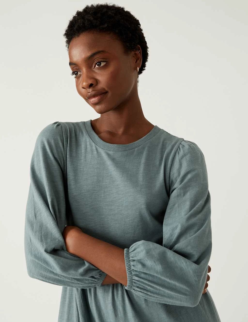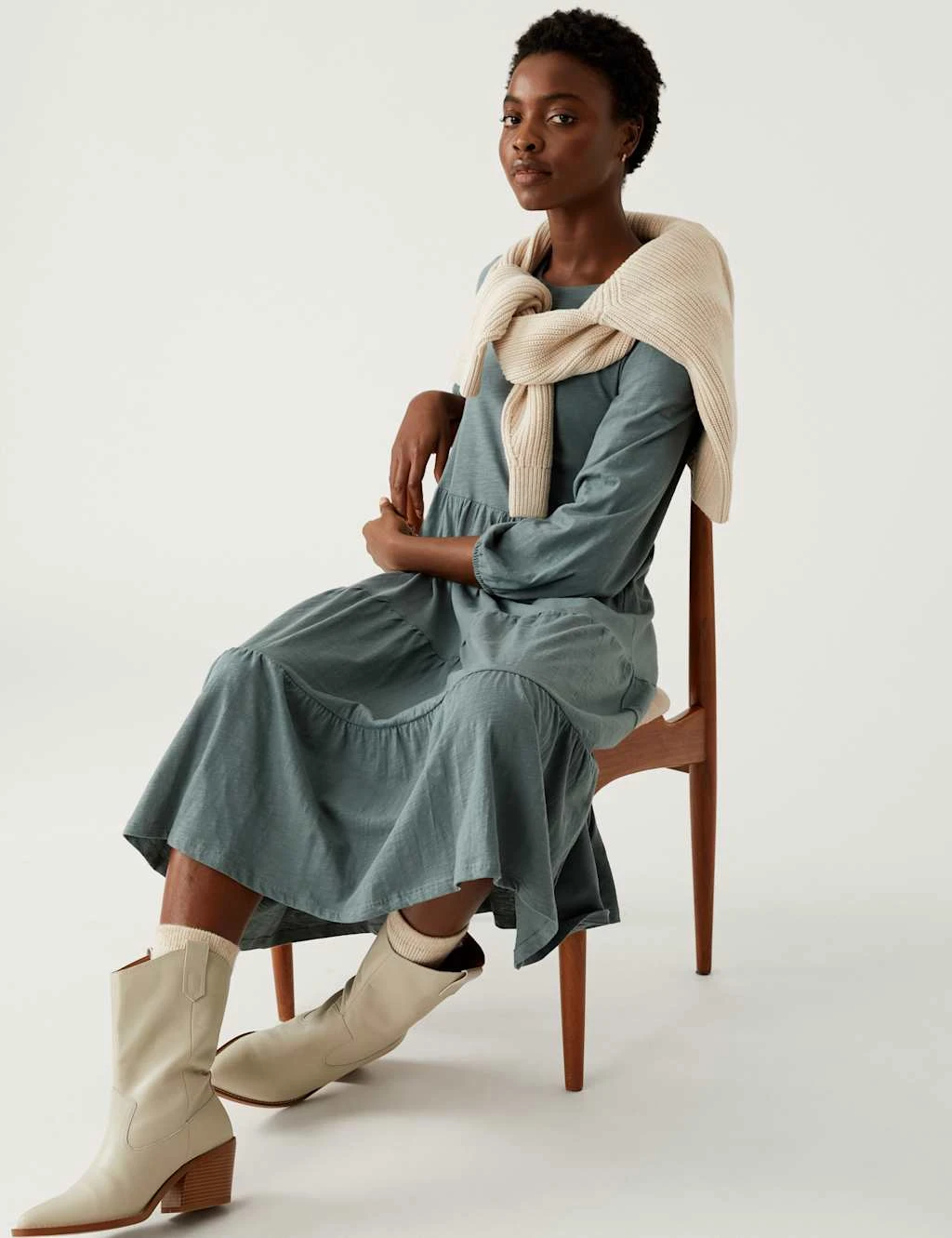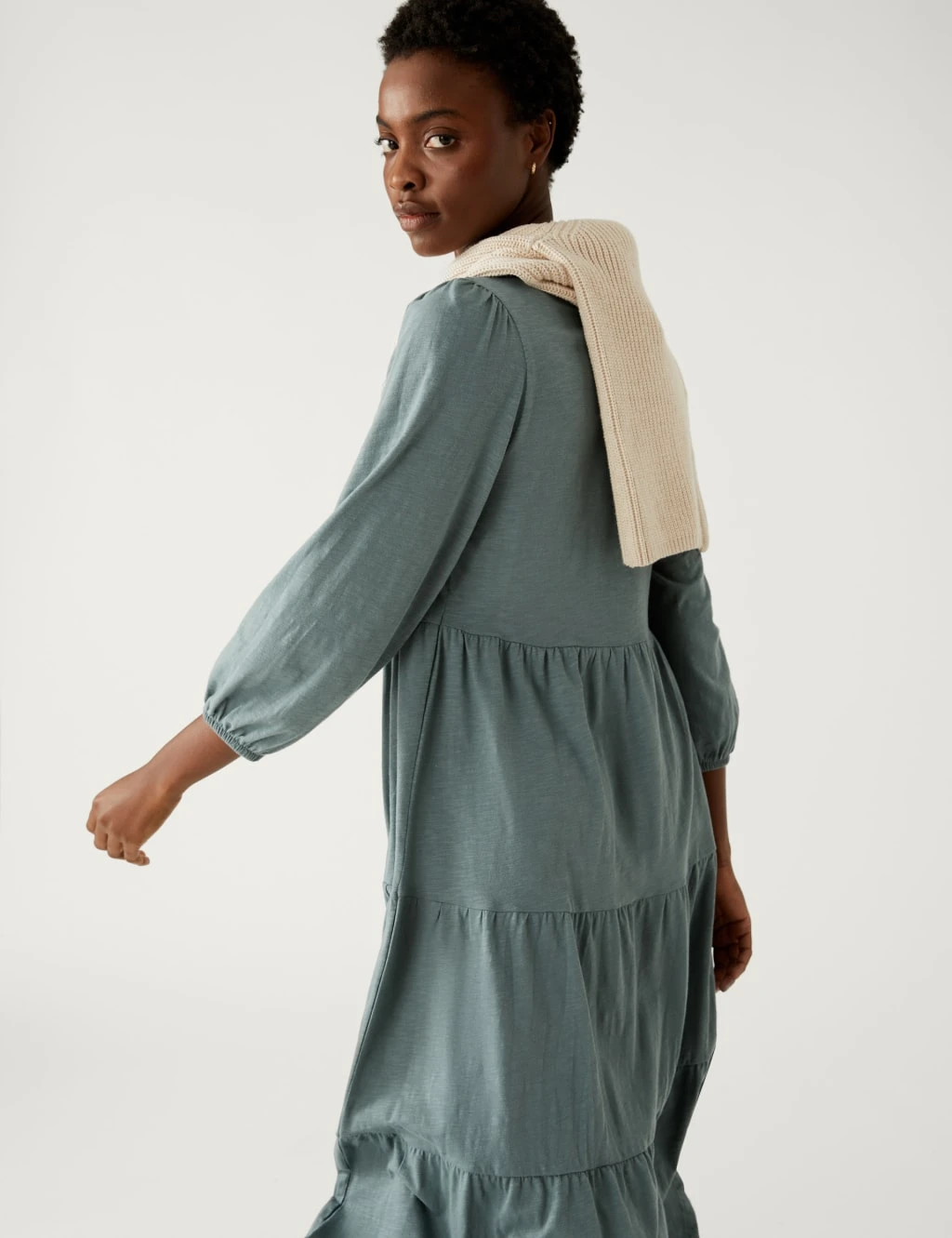 Add a feminine feel to your off-duty style with this cotton jersey dress. The long-sleeved style is cut to a regular fit with a ribbed round neck, creating a casual look. A tiered, midi-length skirt adds a swishy feel.