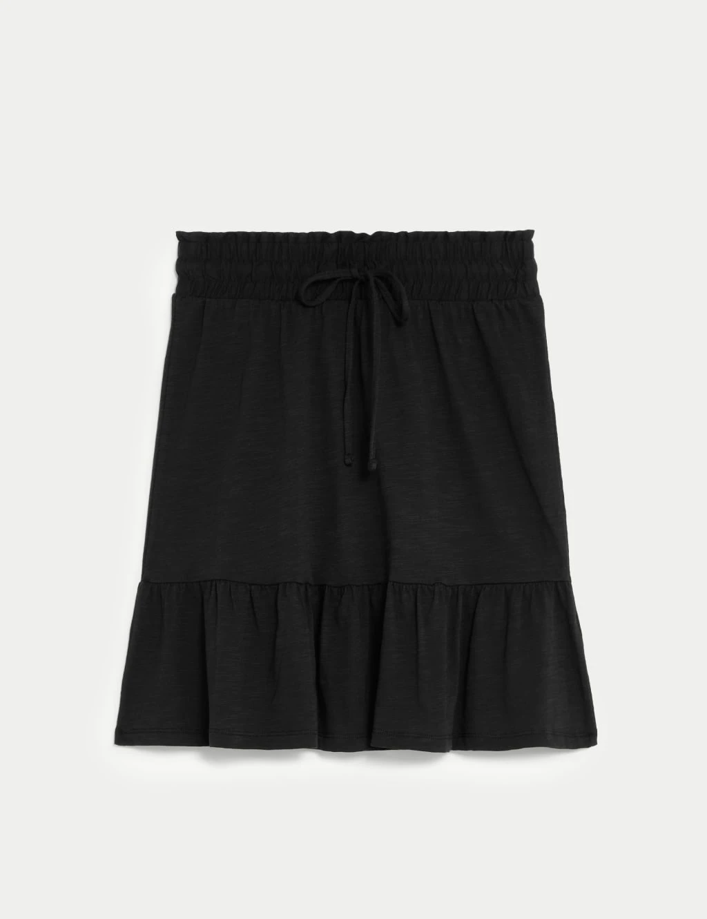 This mini skirt is made from pure cotton jersey for the perfect balance of style and comfort. It’s designed with a drawstring fastening at the waist for effortless wear. The tiered hem adds an elegant touch.