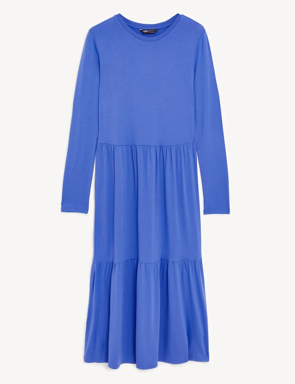 For everyday elegance, choose our soft jersey dress. It’s cut in a regular fit, with added stretch in the fabric for comfortable wear. The bodice features an elegant round neckline and slim long sleeves. A midaxi-length skirt with gathered tiers offers a flowing finish.
