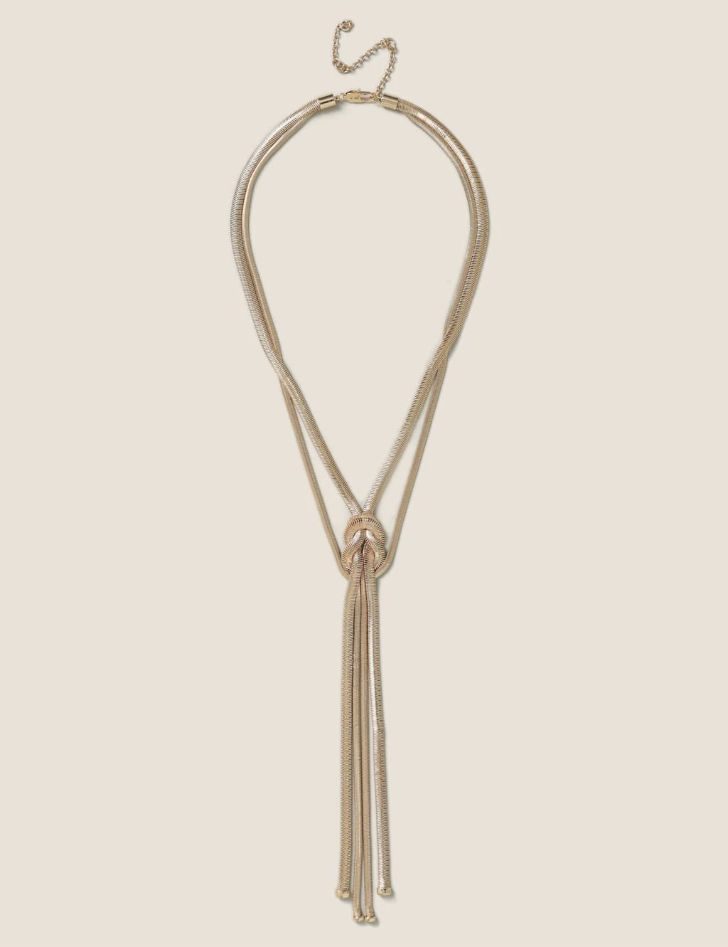 Make a beautiful statement this summer with this gold tone knot larriet necklace.