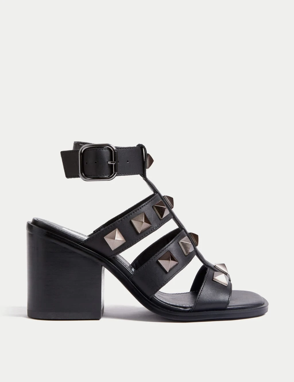 When a party calls, these leather sandals step up. They’re designed with a high block heel for a statement shape and a cage around the foot for a gladiator effect. A buckle fastening at the ankle keeps them in place, while metal studs accentuate the bold look. Antibacterial padding gives freshness.