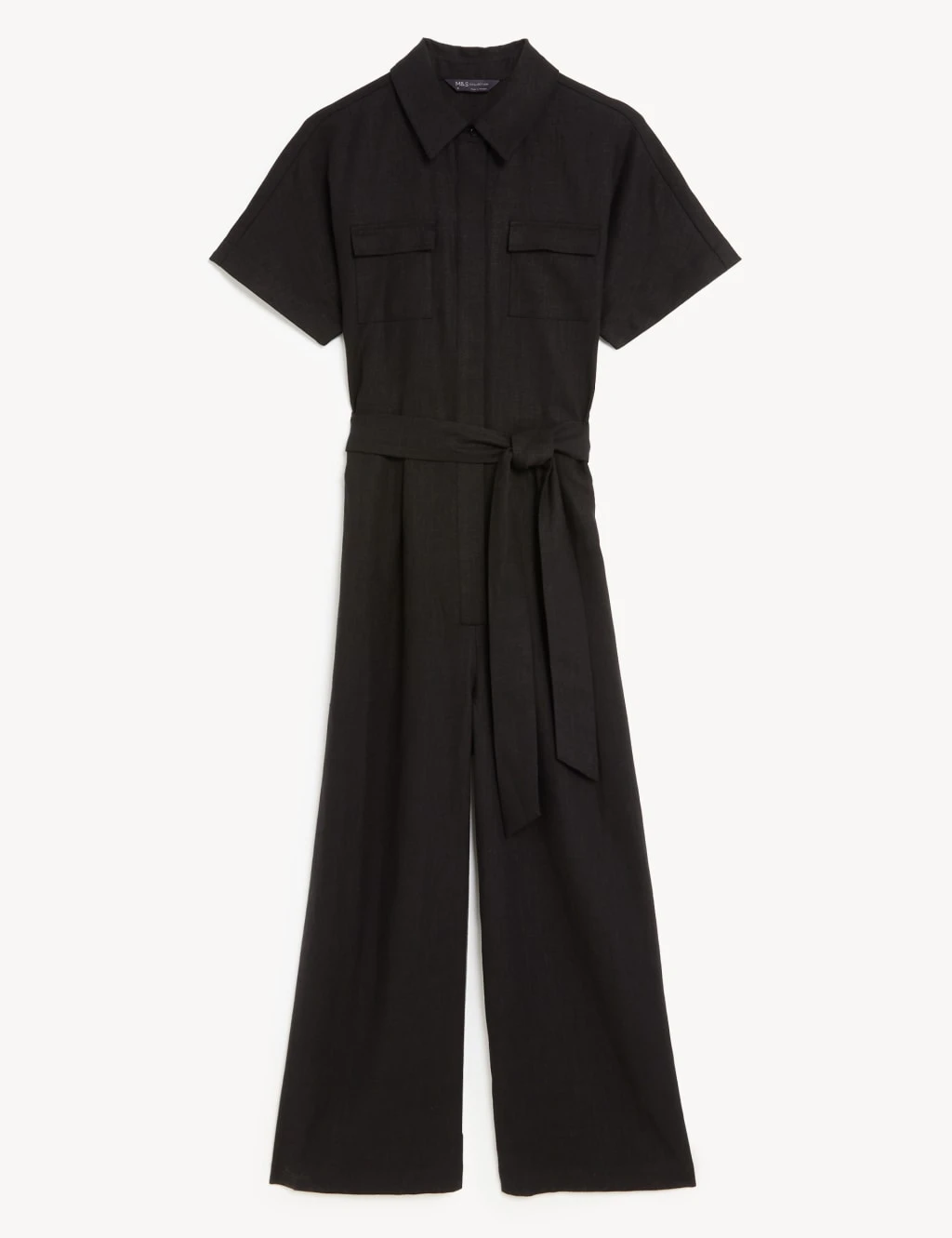 Make a sleek style statement in this linen-blend, short-sleeved jumpsuit. Cut in a regular fit, it sports a neat collared neckline and concealed button fastenings. A tie belt highlights the waist, while cropped trousers give an on-trend edge. Two chest patch pockets complete the look.
