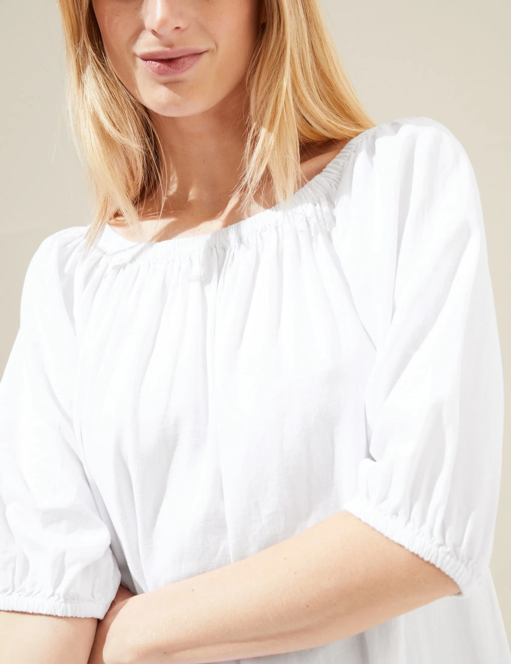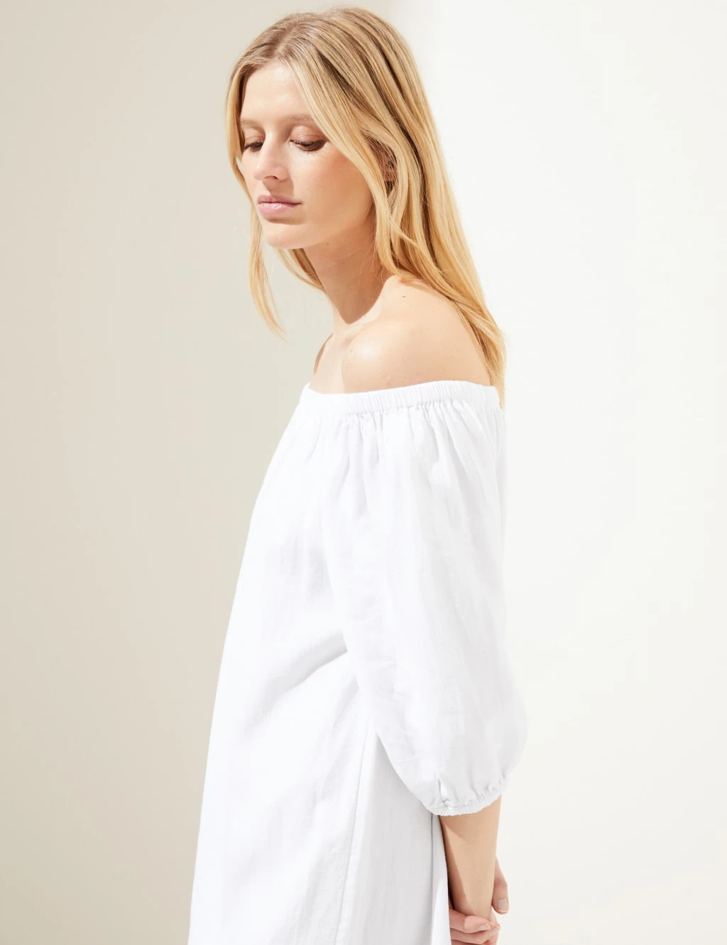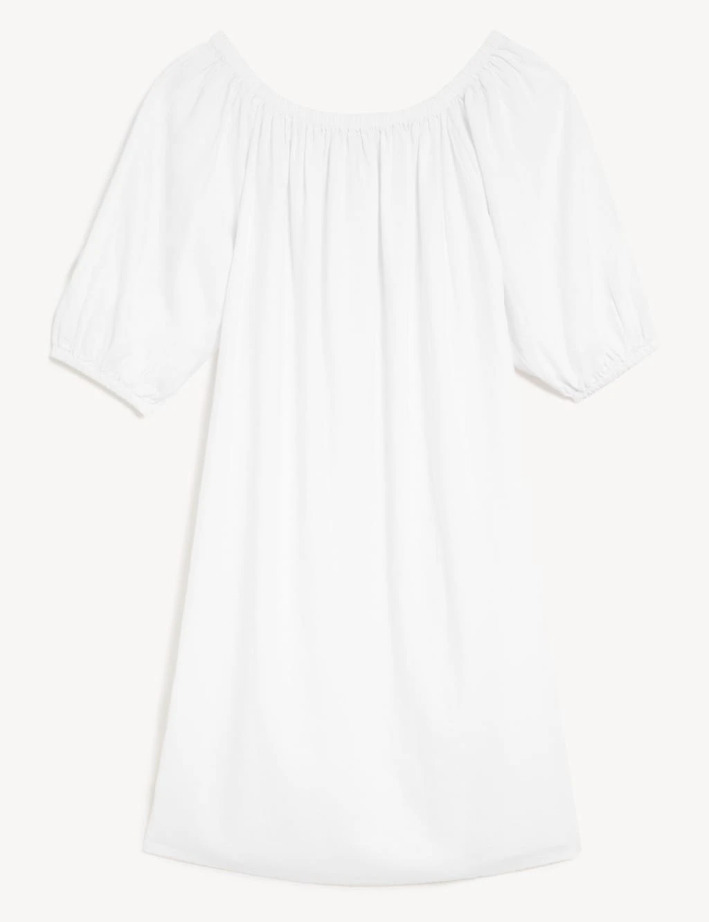 This linen-rich shift dress has a classic Bardot neckline for an elegant look. Made in a regular fit, it drapes subtly from the gathers at the top down to the knee-length hem. Short puff sleeves with elasticated cuffs add volume and complement the standout neckline.