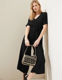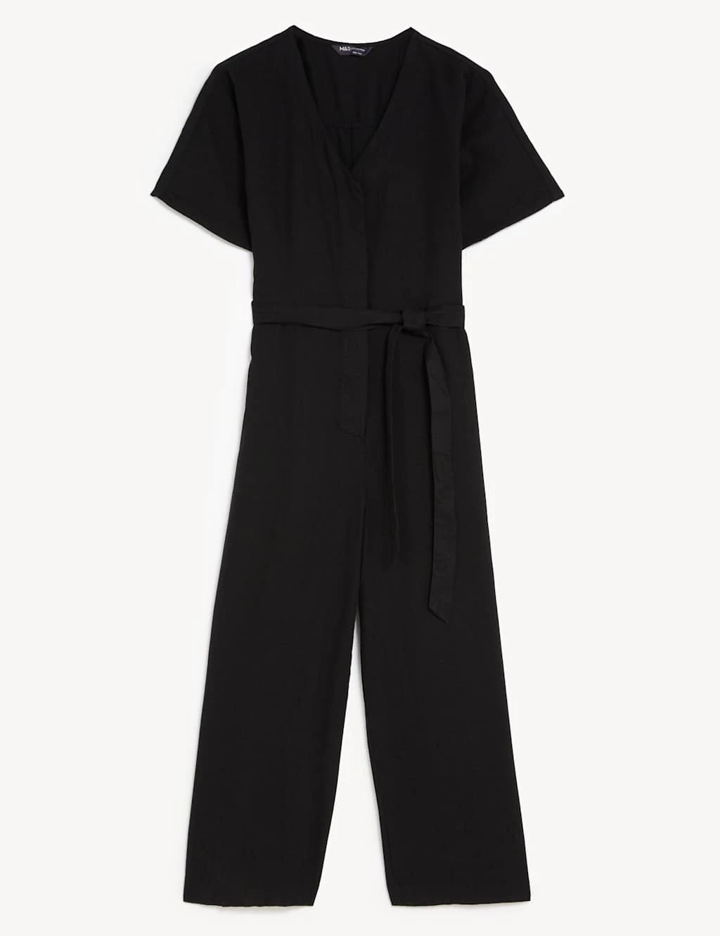 This linen-rich cropped jumpsuit is perfect for taking you from day to night. It’s crafted in a regular fit with a belt at the waist for cinching your figure and flattering wide legs. The classic v-neckline and neat button fastening add a touch of sophistication, while the loose-fitting short sleeves nicely complement the shape.