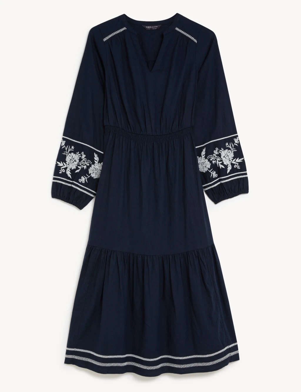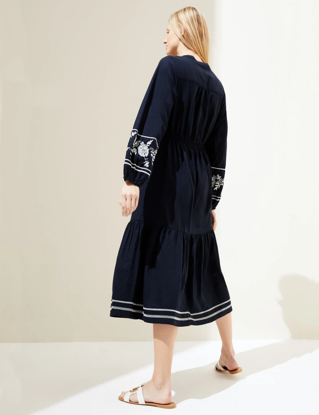 This linen-rich waisted dress is perfect for elevating your everyday look. It’s made to a regular fit with a flattering v-neck. An elasticated waistband and tiered midi skirt create an elegant silhouette. Embroidered trims on the shoulders and hemline, plus floral designs on the voluminous sleeves, add an extra romantic touch.