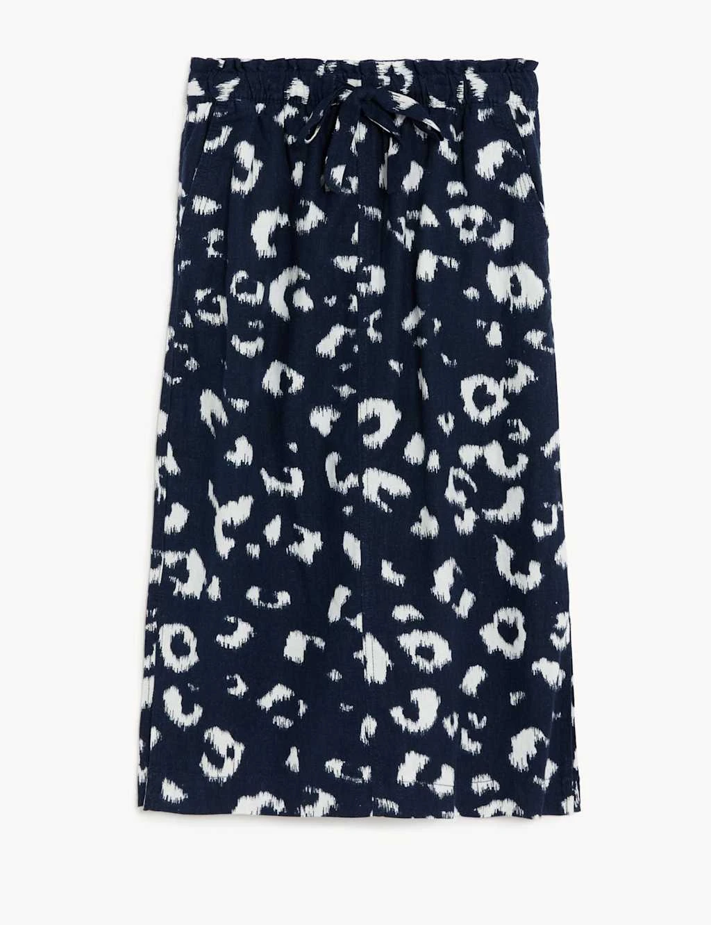 Elegant styling meets breezy linen-rich fabric with this midi skirt. It features a comfortable elasticated waist that fastens with a tie. Splits on either side of the hem add easy movement to the skirt, while slip pockets make for a practical finishing touch.