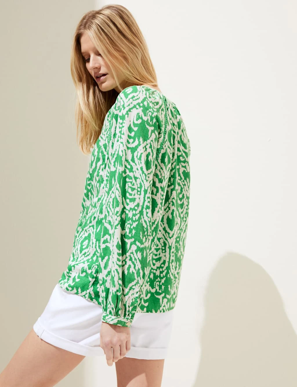 Inject some print into your wardrobe with this vibrant linen-rich blouse. This button-down piece is cut to a regular fit, framed by long sleeves and a collarless v-neck. Features pretty ladder trim detailing on the shoulders.