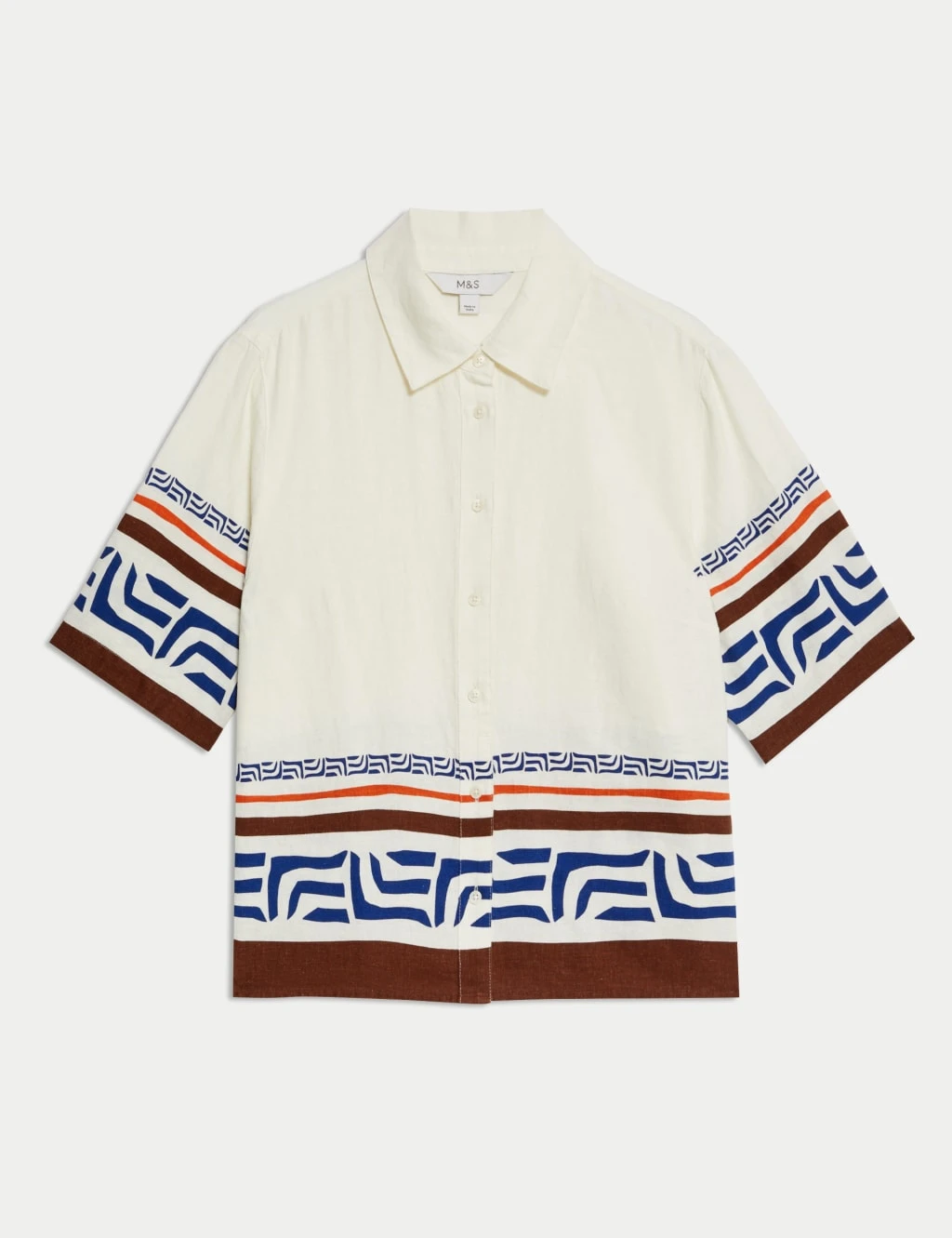 Stay cool and stylish in this printed top, crafted from breathable, linen-rich fabric. Cut to a regular fit with short sleeves and a collared neckline, it offers a smart yet relaxed look. The button-through front adds a polished finish, perfect for easy warm-weather dressing. M&S Collection: easy-to-wear wardrobe staples that combine classic and contemporary styles.