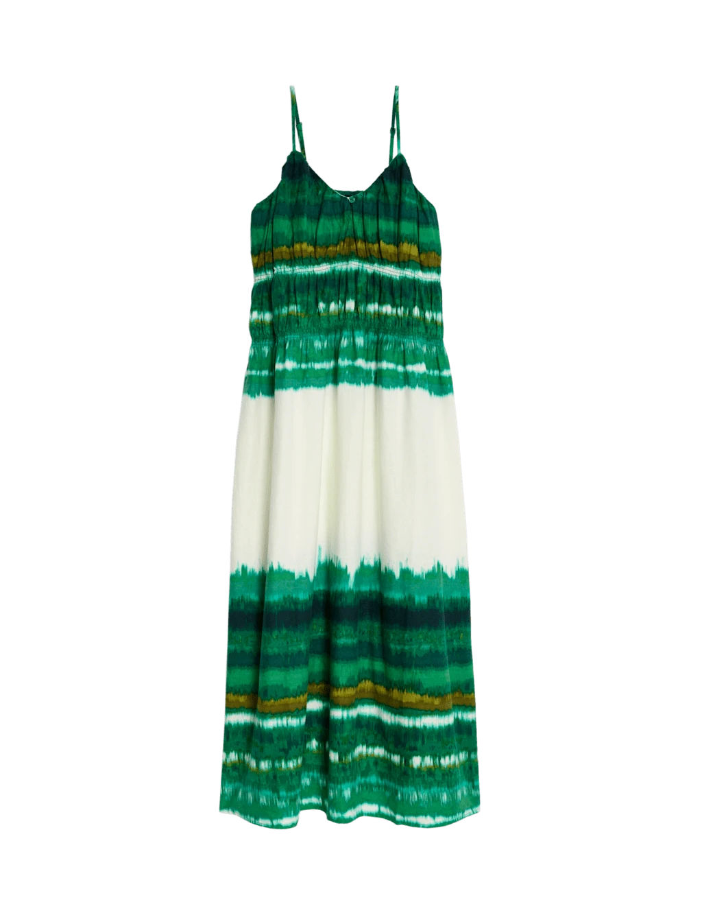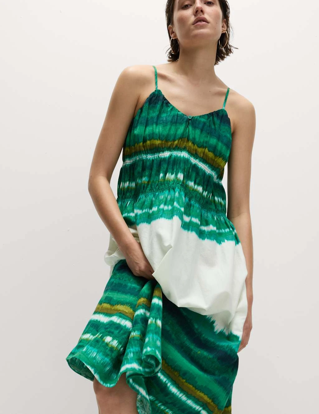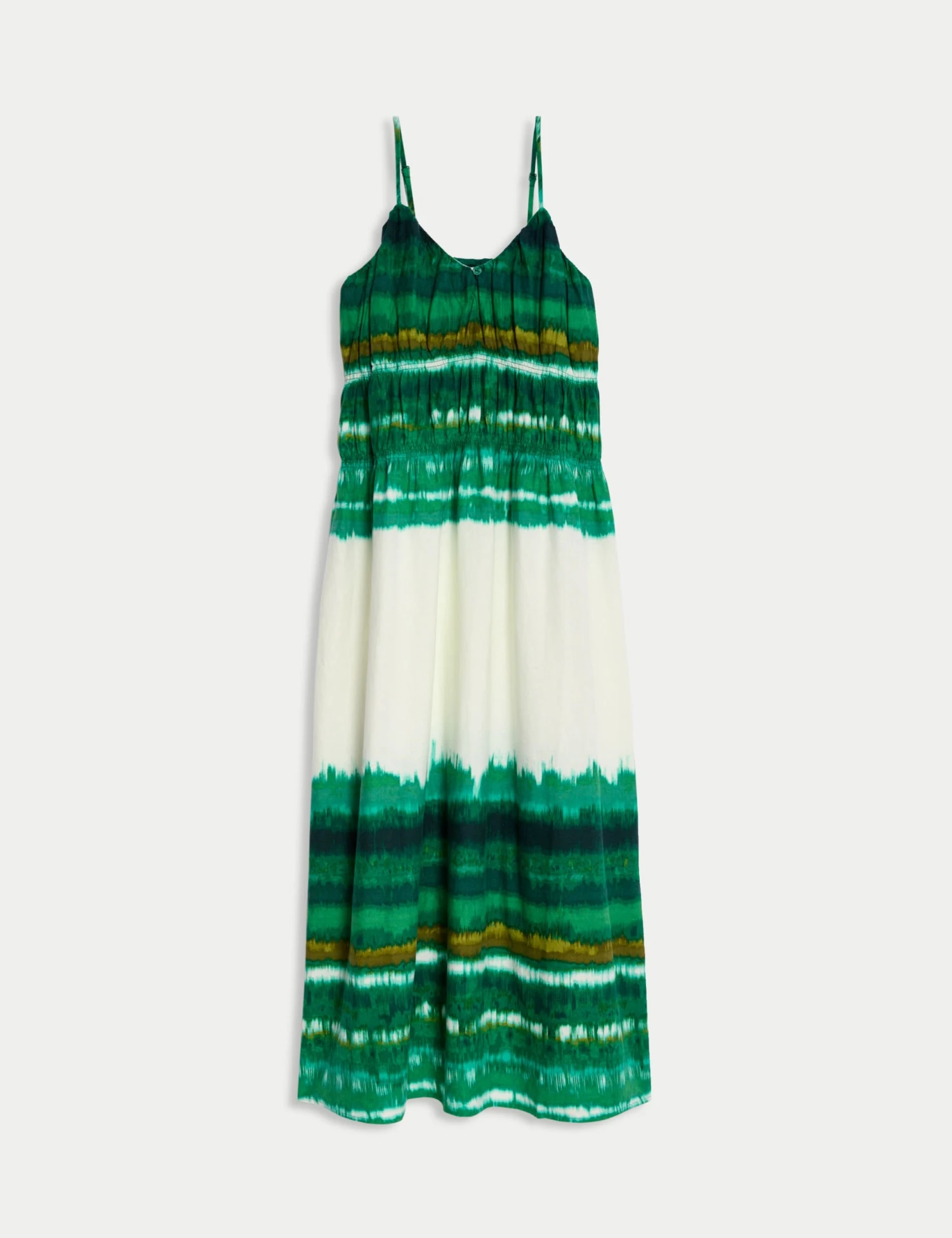 This linen-rich swing dress is a perfect choice for sunny days. It’s designed in an easy regular fit, with a flattering v-neckline and airy spaghetti straps. The midaxi-length skirt features a tier for added swish, while the bold print brings a statement look. A row of buttons down the front adds a neat finish. M&S Collection: easy-to-wear wardrobe staples that combine classic and contemporary styles.