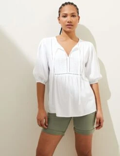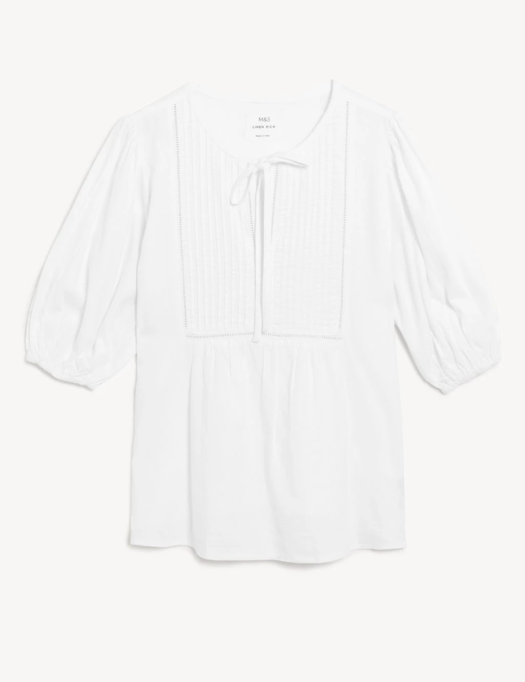 This breezy linen-rich blouse is an easy, elegant piece for everyday. Cut to a regular fit, it features short puff sleeves and a bib front with lace trimming. The round neck fastens with a chic tie.