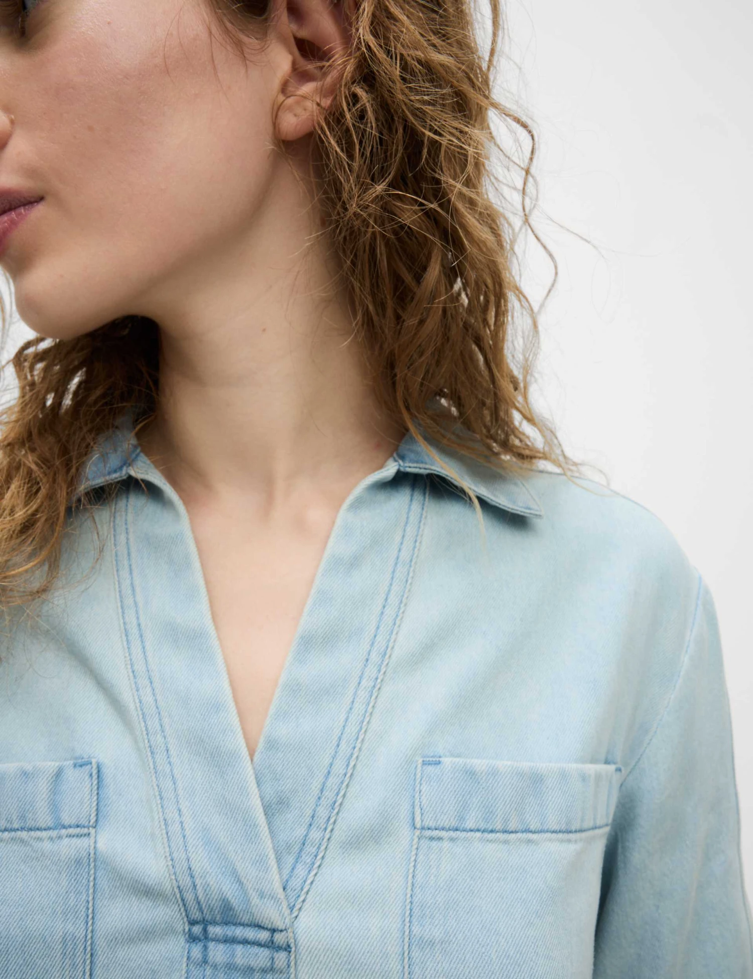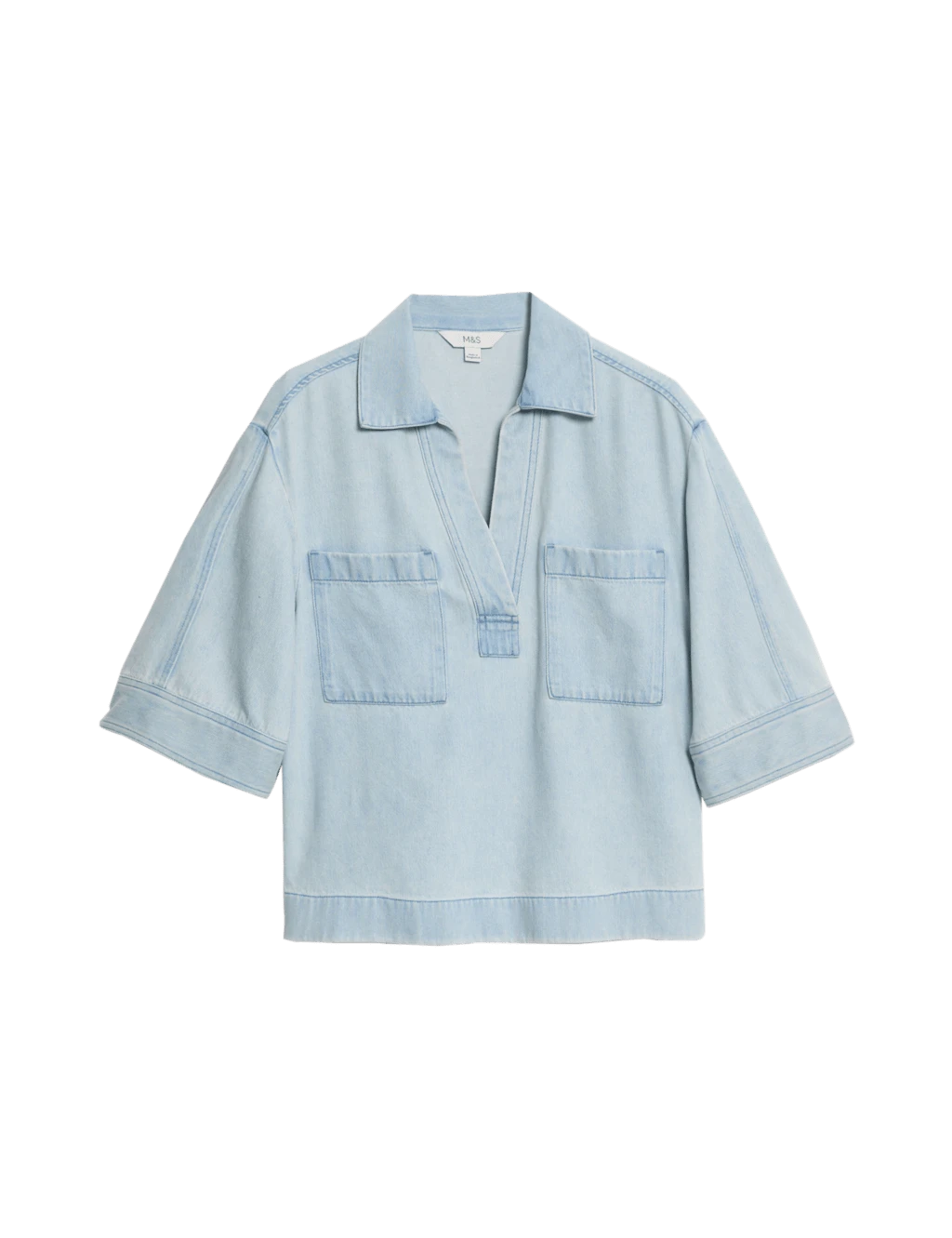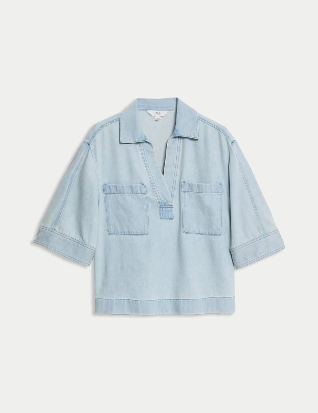 This short-sleeved shirt has a cropped length to give a modern look. Crafted in a comfy oversized fit from soft lyocell™ denim, featuring a collar that leads to a v-neck for a neat touch. Complete with two handy patch pockets on the chest. M&S Collection: easy-to-wear wardrobe staples that combine classic and contemporary styles.