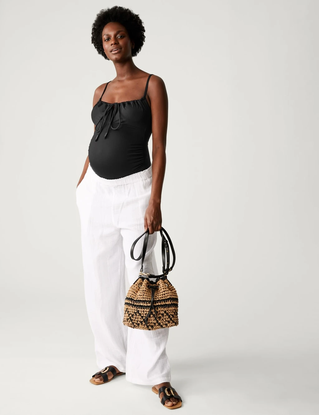 Our maternity swimsuit has ruched sides for a stretchy fit, with an attractive scoop neck detail. Adjustable straps and a tie fastening provide a secure fit. Padding can be removed if you prefer a softer cup. Fabric has a Sun Smart UPF50+ finish to help protect you from UV rays. M&S Collection: versatile styles in modern shapes with unique and playful details.