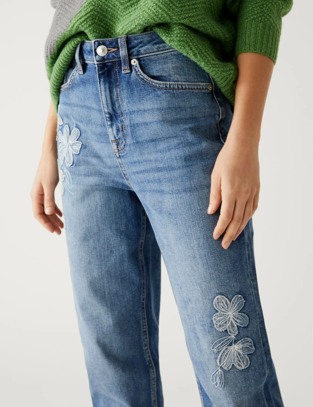 Say hello to your new favourite cotton-rich jeans. They’re cut in a comfy mom fit with a flattering high waist. Contemporary ankle-grazer length and added stretch for all-day comfort. Embroidered flowers add an extra dash of femininity. All M&S denim is made with responsibly sourced cotton and less water. M&S Collection: easy-to-wear wardrobe staples that combine classic and contemporary styles.