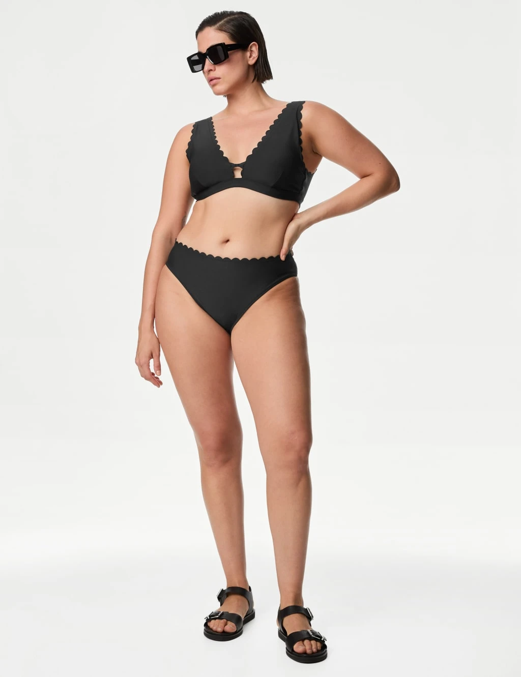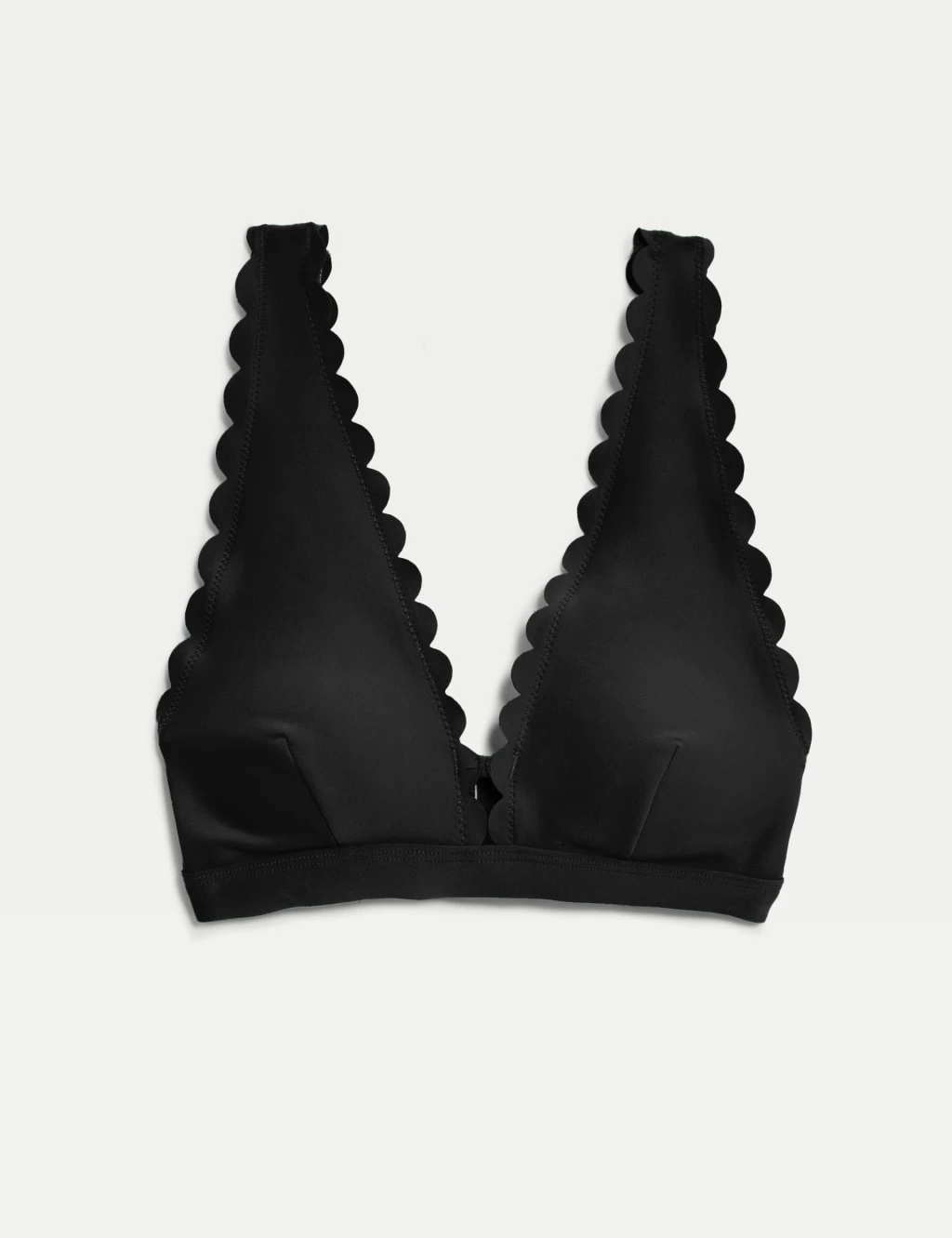 Scalloped edges bring a playful look to this neoprene bikini top. Cut in a regular fit, with a plunging neckline and easy clasp fastening. It’s padded, wire-free and fully lined for comfort, while added stretch ensures a flexible feel. Our Sun Smart UPF50+ finish offers extra protection against harmful UV rays and a chlorine-resistant finish helps the fabric keep its shape.