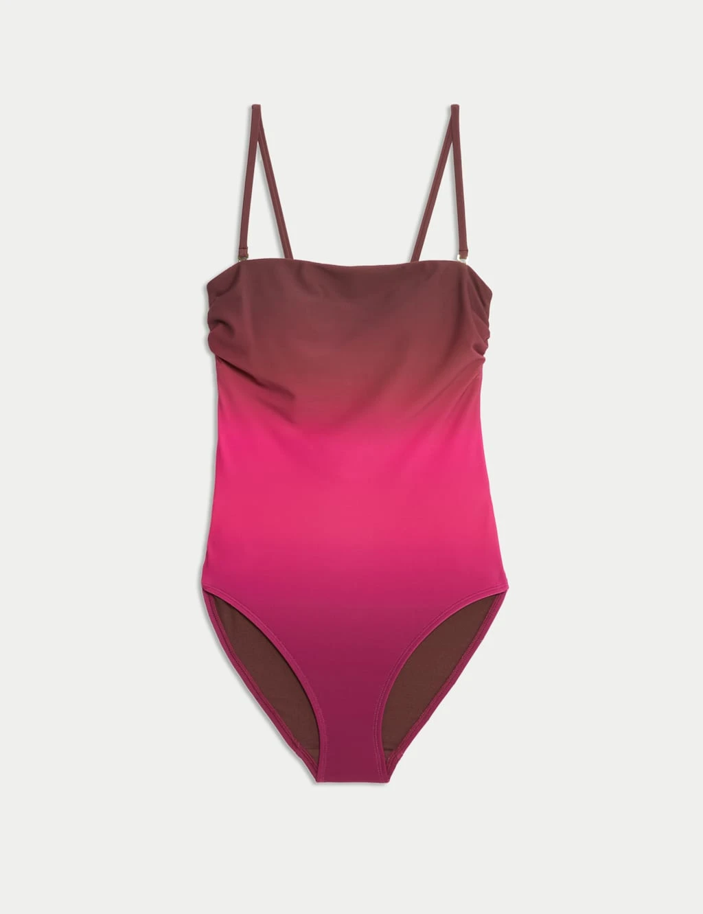 Make a splash with this striking ombre swimsuit. It’s cut in a regular fit with a flattering square neckline and removable padded cups for a smooth shape. Adjustable straps can be worn straight or crossed for versatile styling, while chlorine-resistant fabric keeps it looking fresh for longer. Added stretch ensures comfort, and Sun Smart UPF50+ helps protect against harmful UV rays. M&S Collection: versatile styles in modern shapes with unique and playful details.